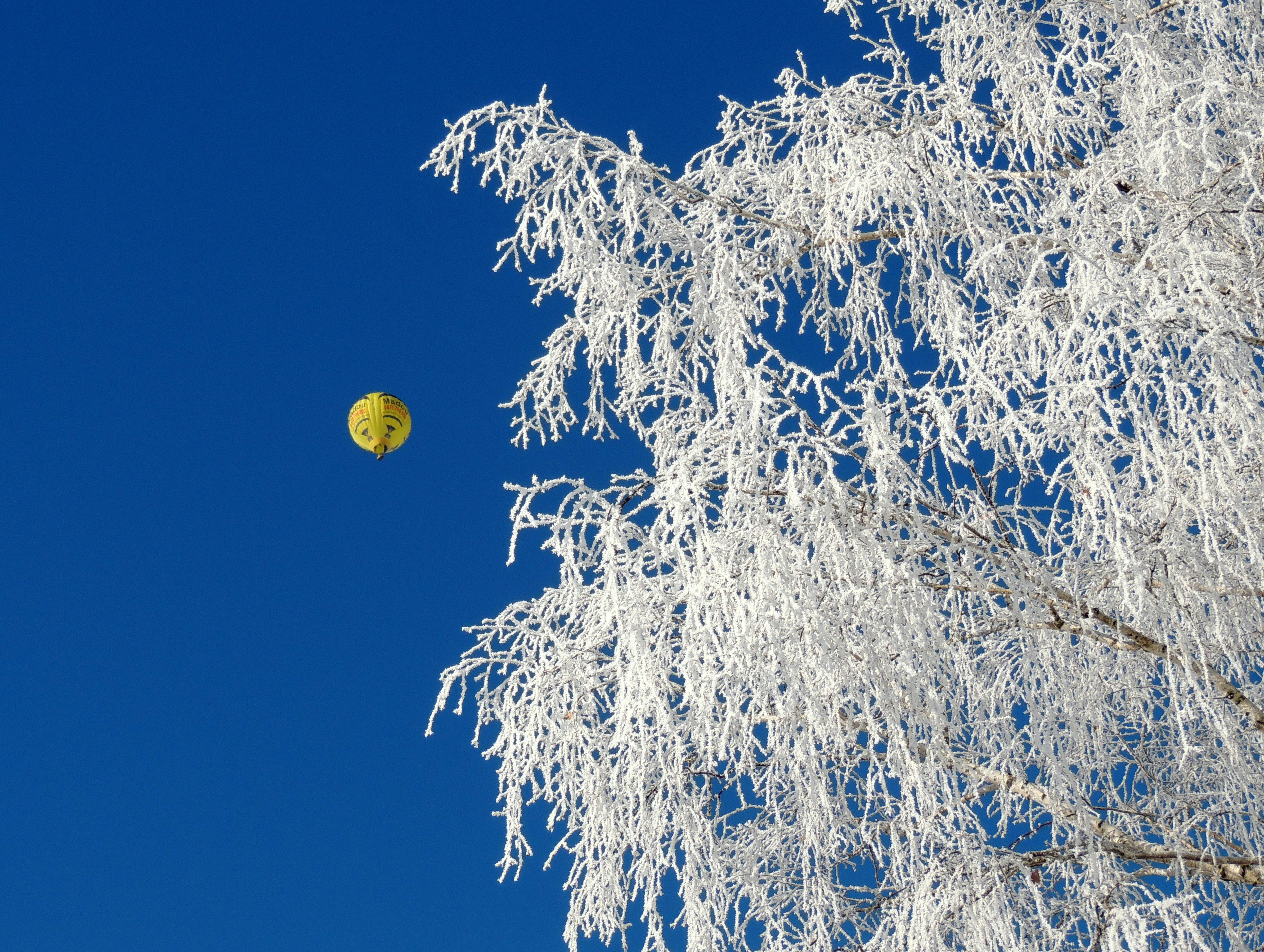 Yellow hot air balloon floats above snowy trees in Walchsee, Tirol, under a clear blue winter sky.