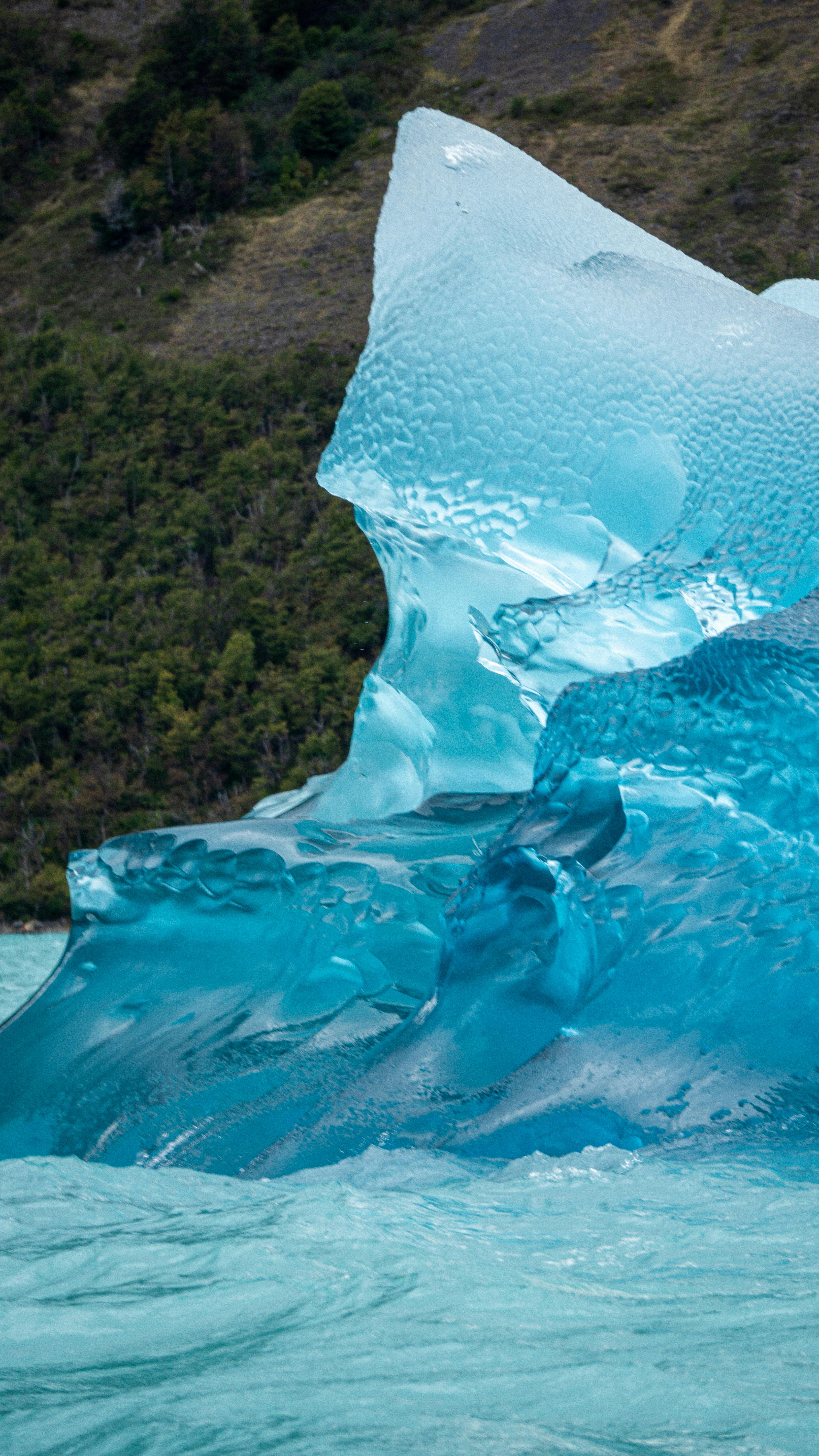 A breathtaking view of a vibrant blue iceberg floating in Patagonia's stunning landscape.