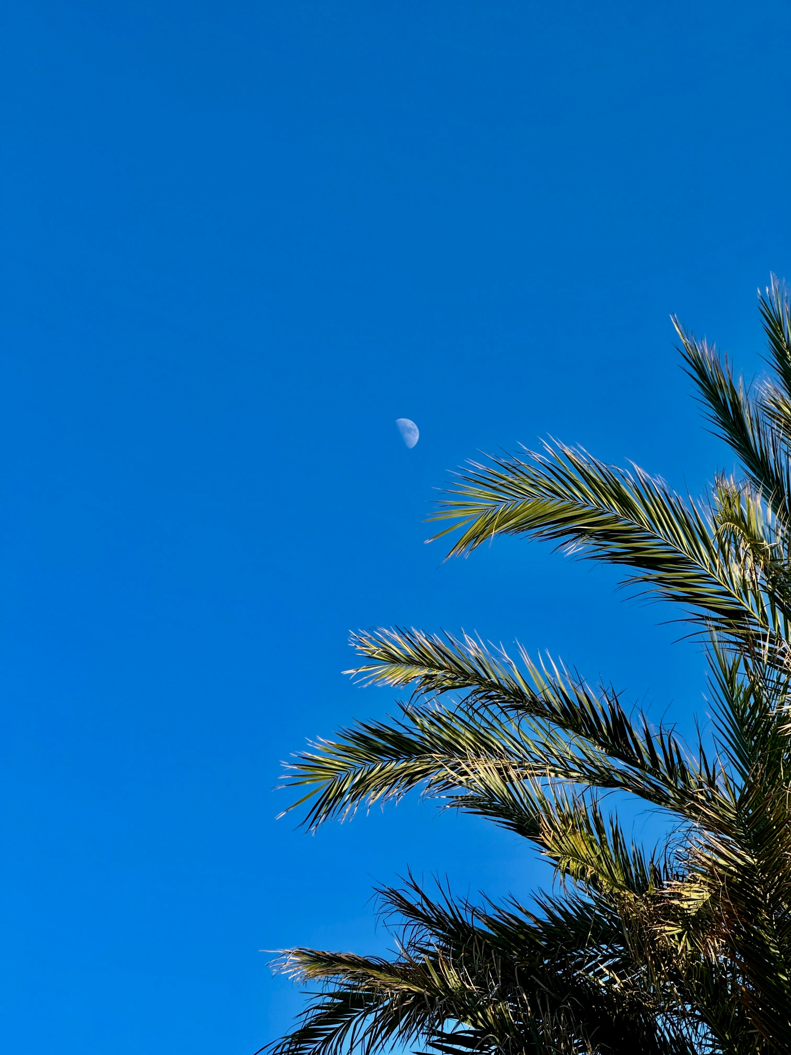 A serene view of palm trees against a clear blue sky with the moon visible, captured in Alicante, Spain.