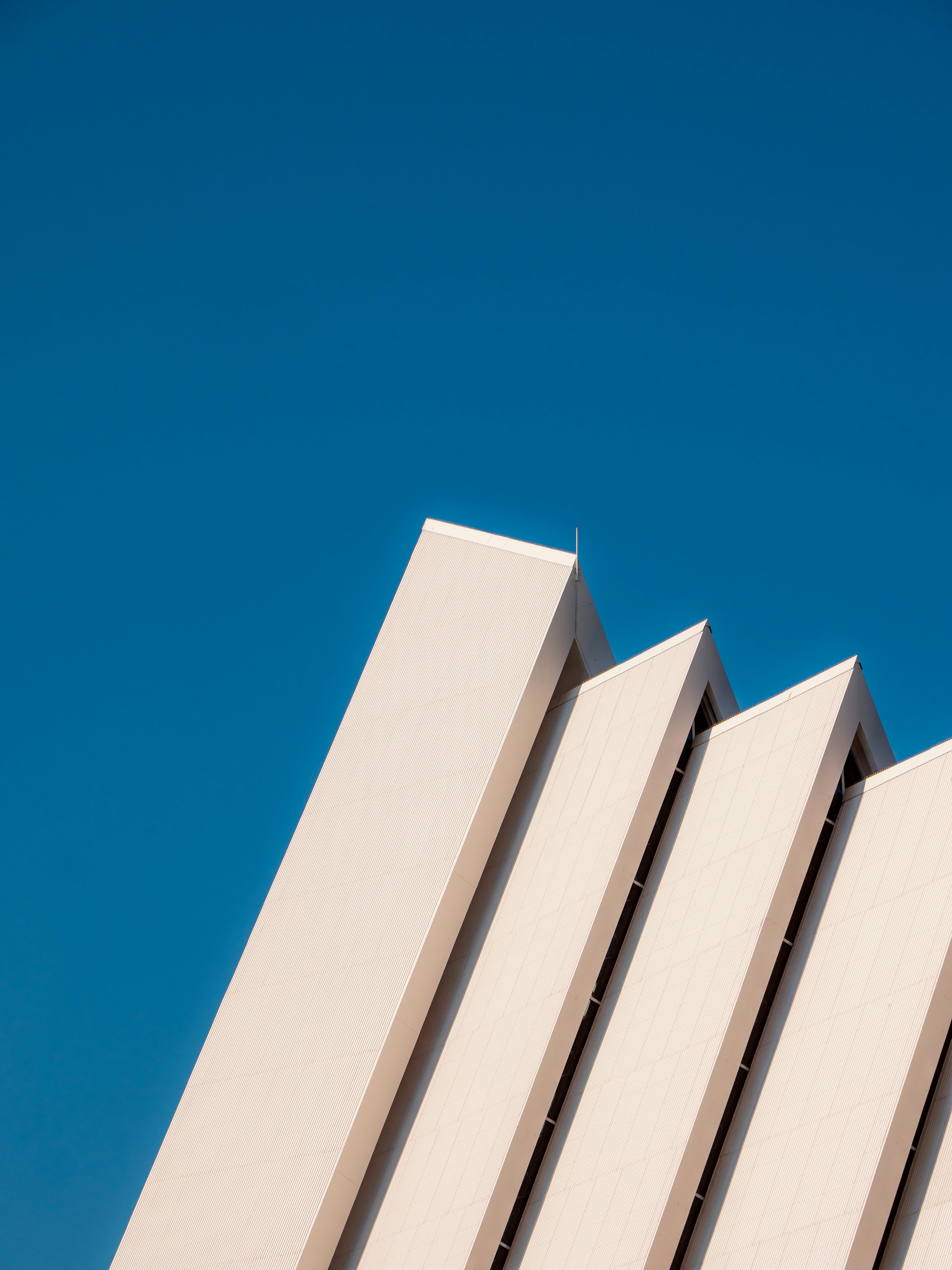 Striking geometric architecture with clean lines against a clear blue sky. Modern and minimalist style.