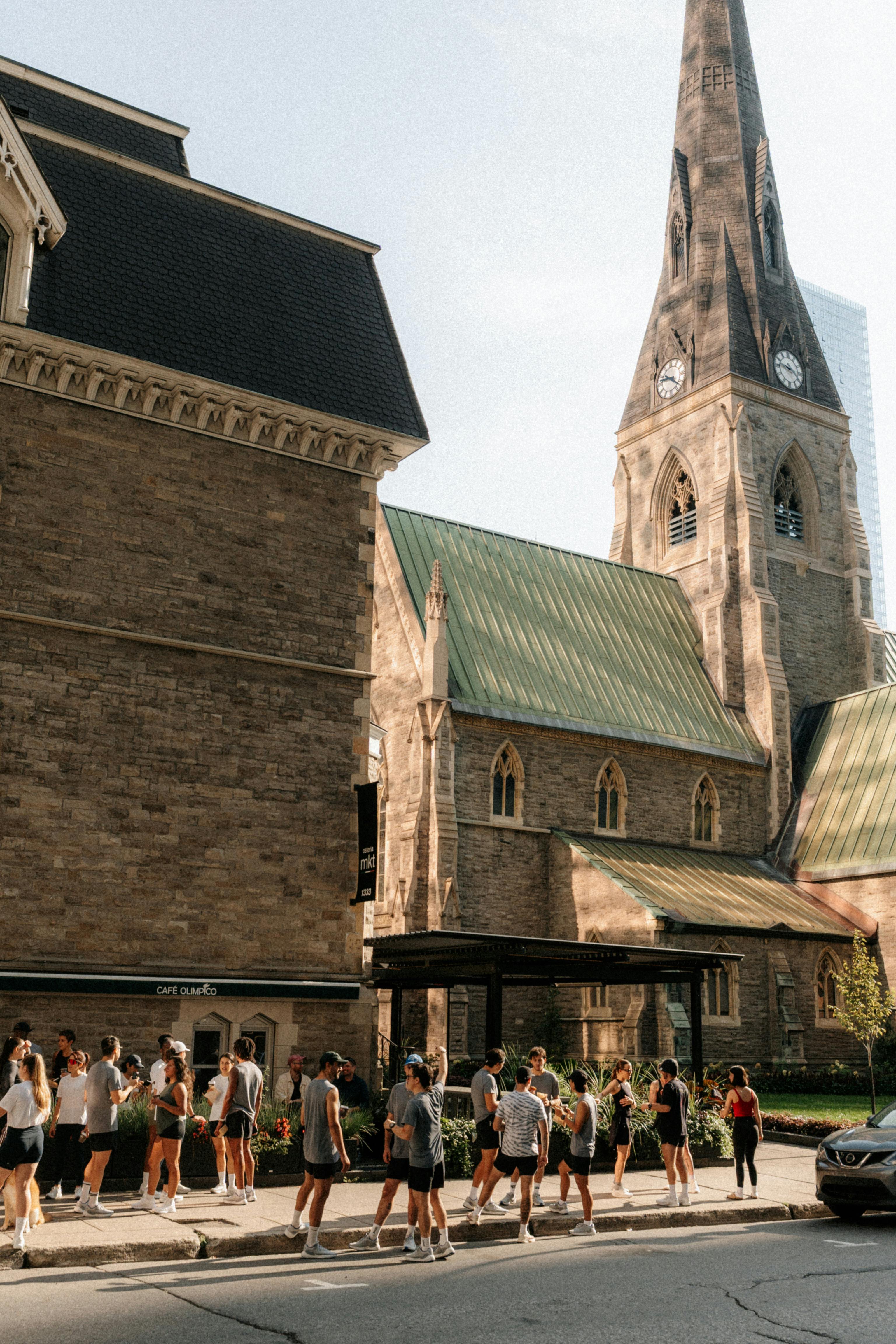 Street view of a historic church with a clock tower, bustling with people and urban life.