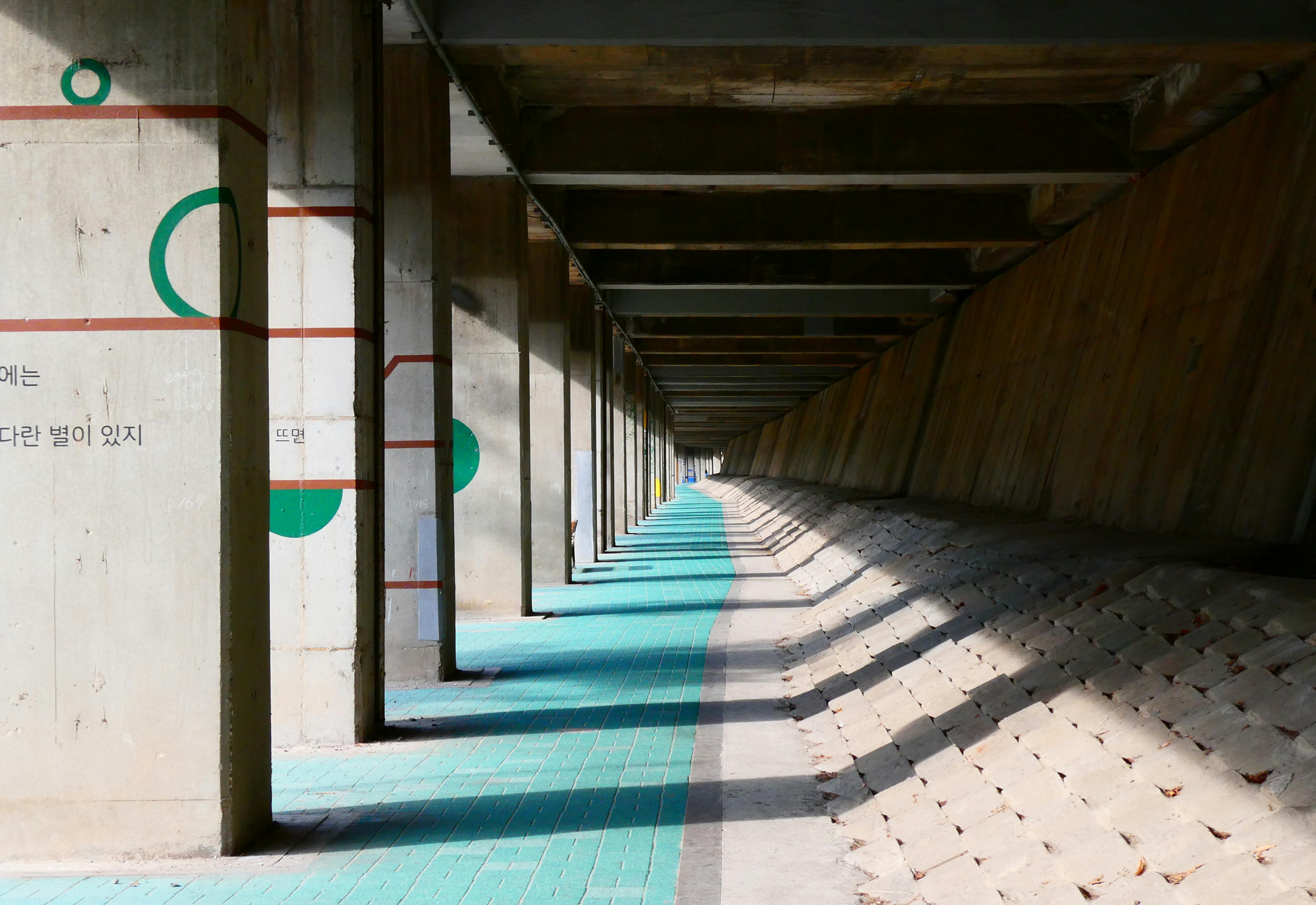 Concrete underpass featuring geometric wall art with angular shadows on a sunny day.
