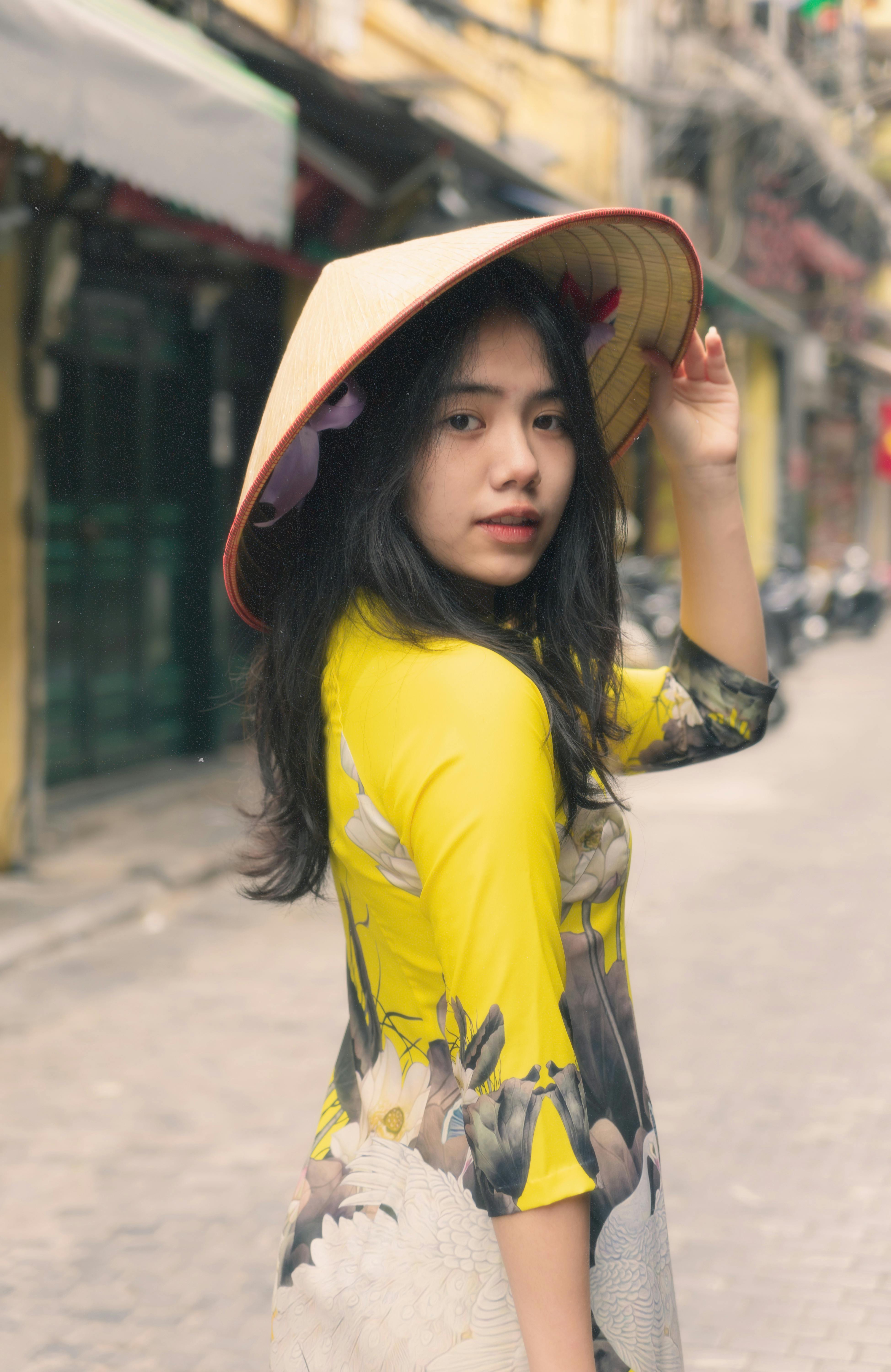 A young Vietnamese woman wearing traditional Ao Dai and a conical hat on a charming street in Vietnam.