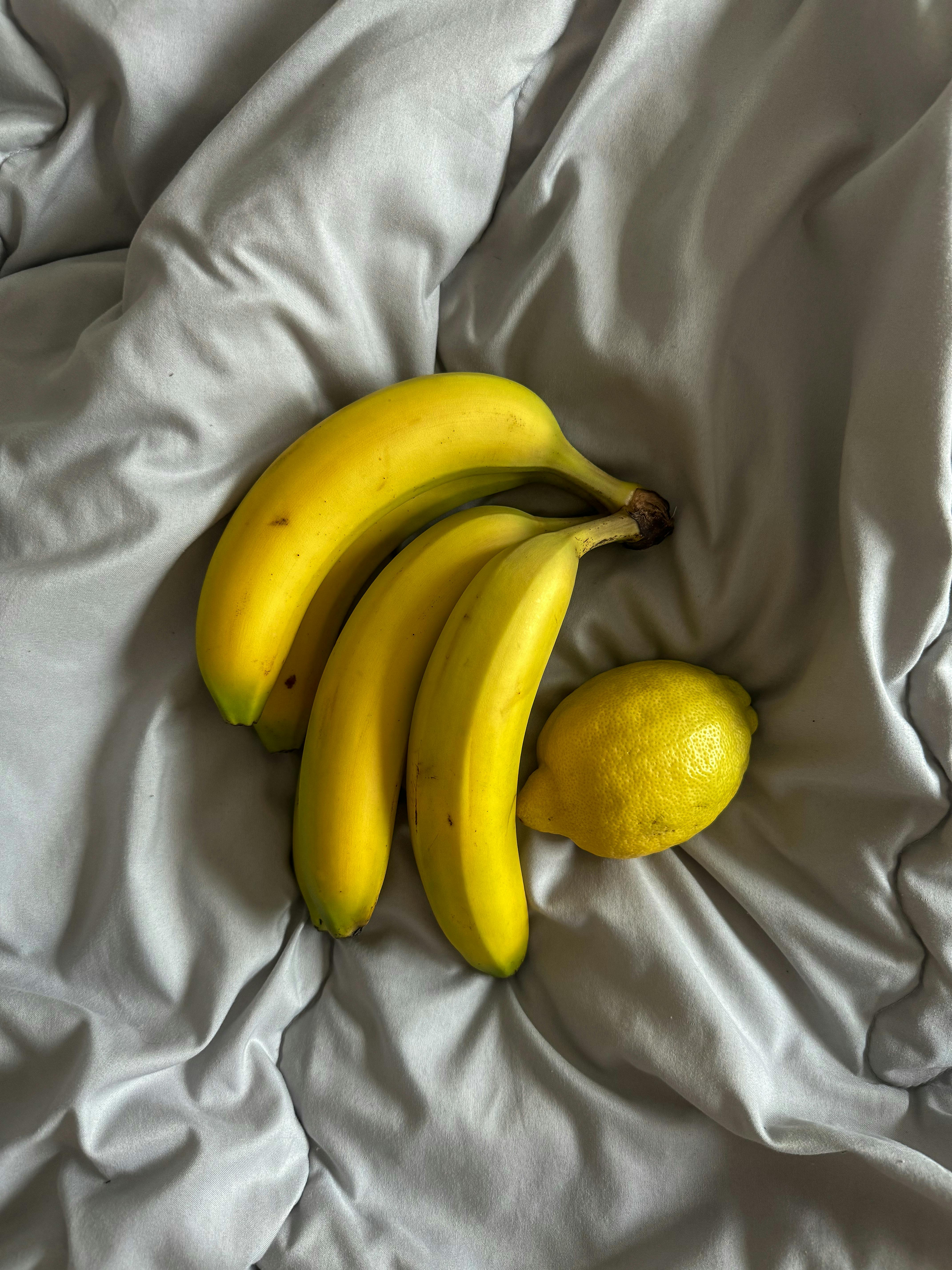 A trio of bananas and a lemon on soft gray fabric, highlighting freshness.