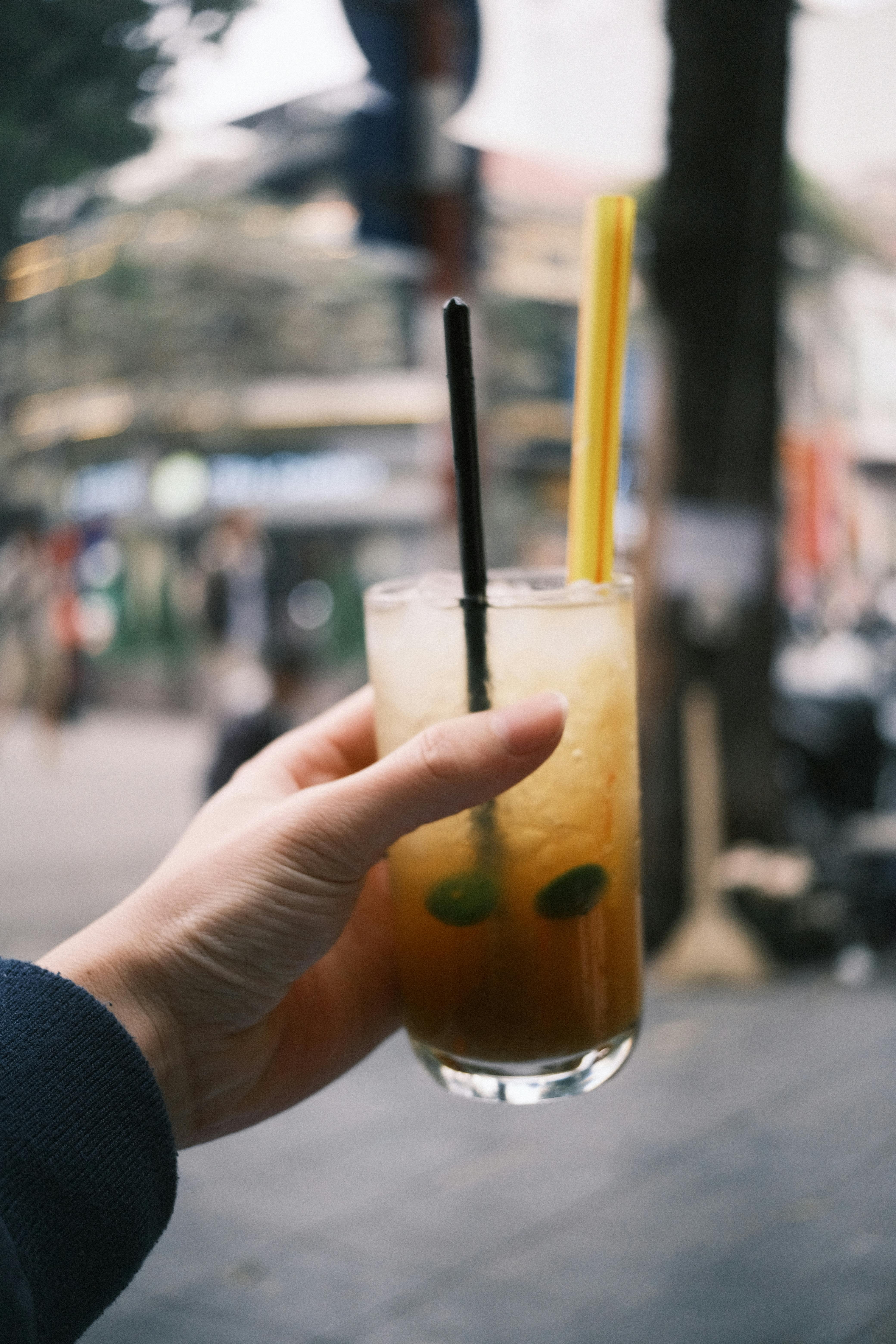 Hand holding a cold iced tea with lemon on a warm day in a bustling outdoor street setting.