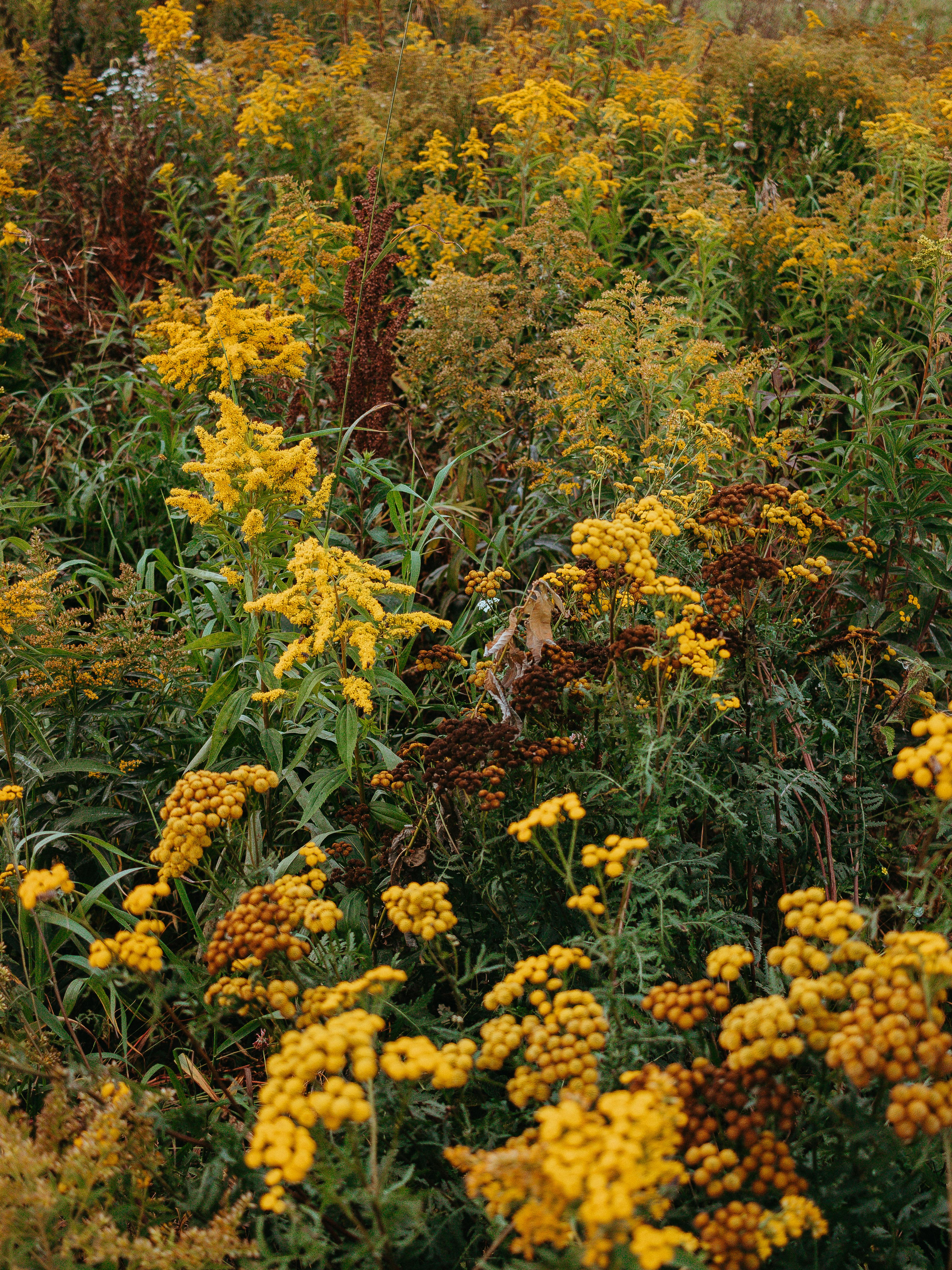 Beautiful yellow wildflowers bloom in a lush meadow during autumn.
