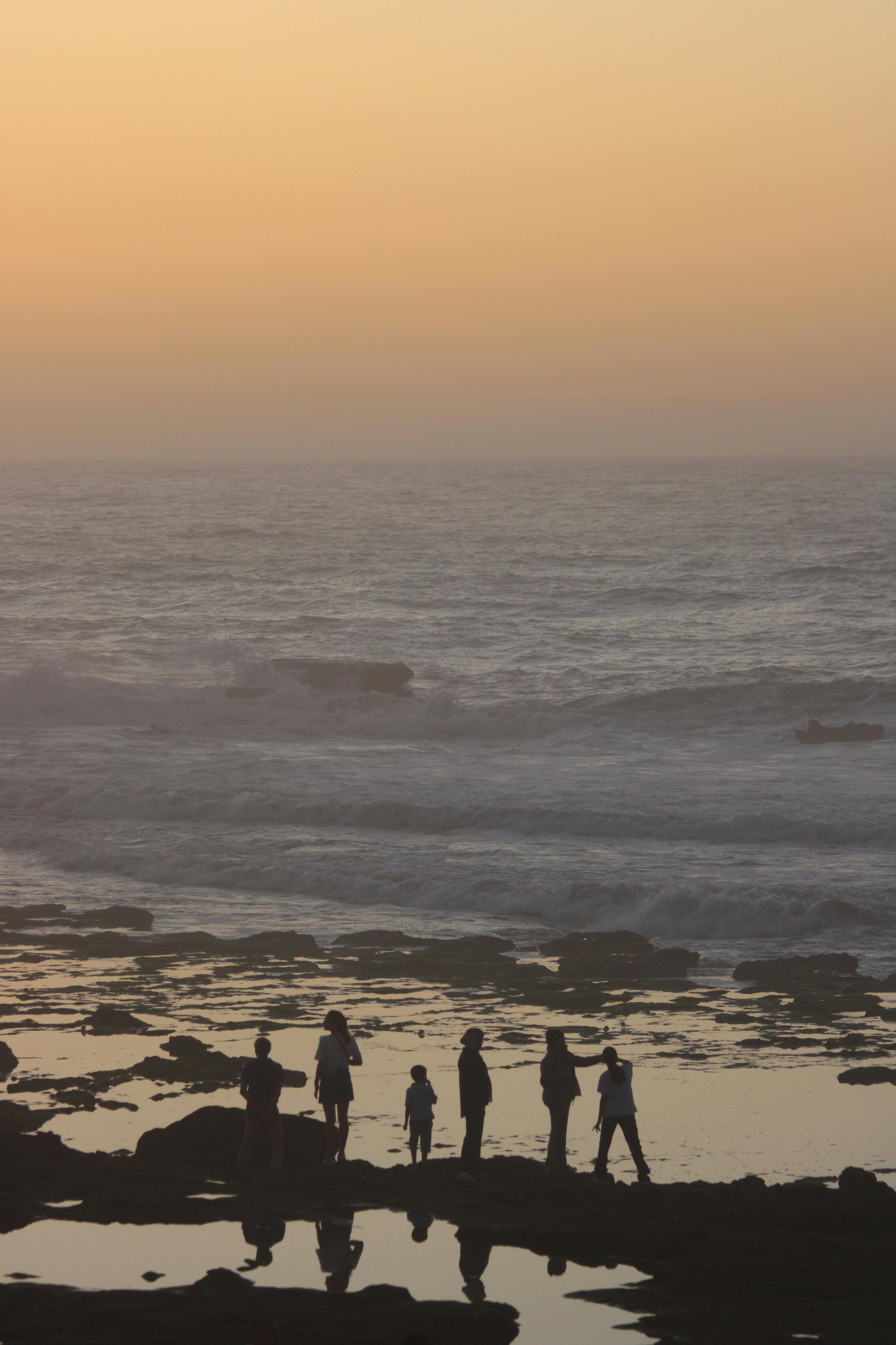 Silhouetted people enjoying a serene ocean view during a beautiful sunset.