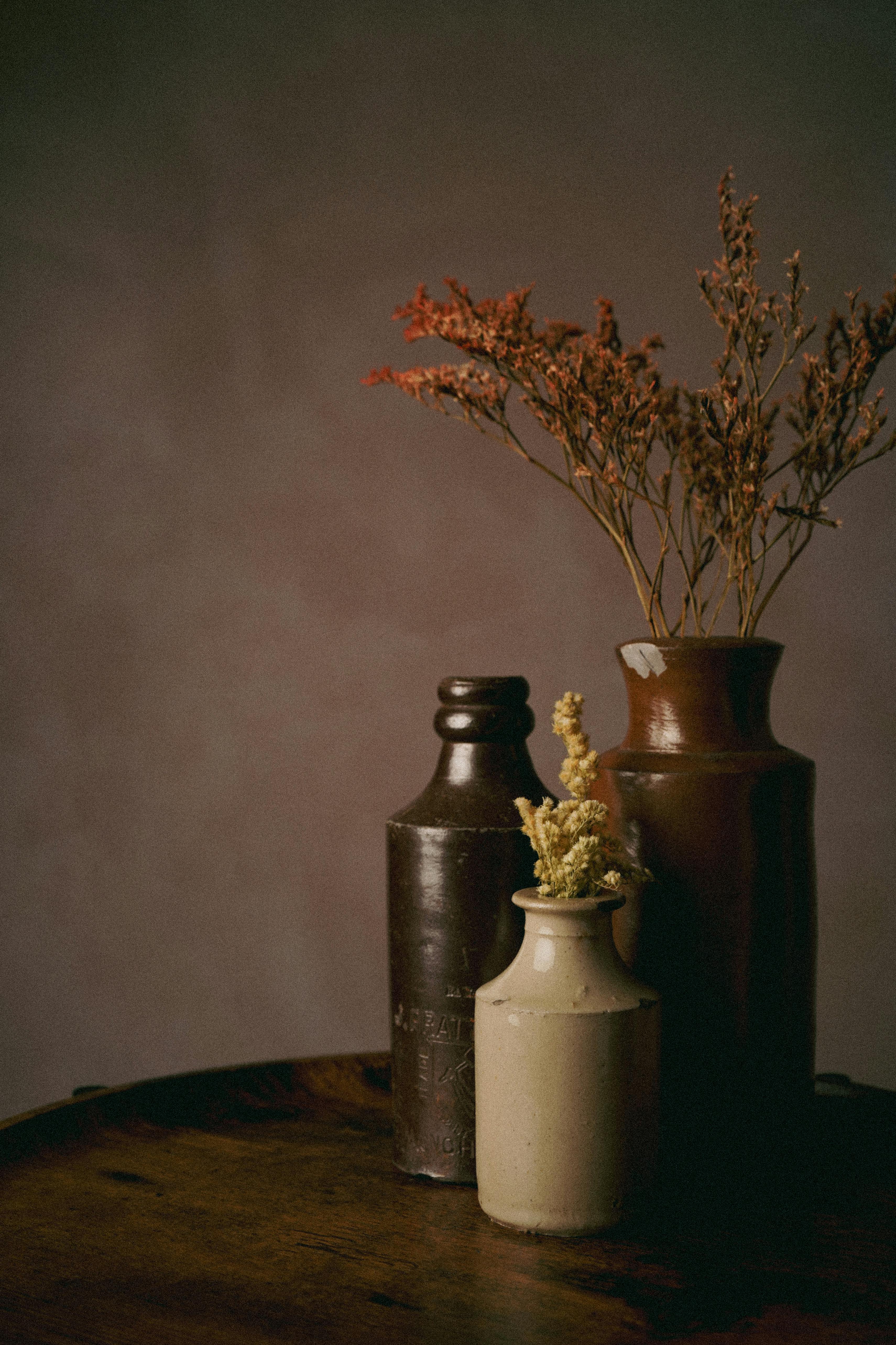 Artistic display of vintage ceramic vases with dried flowers on a rustic table, warm tones.
