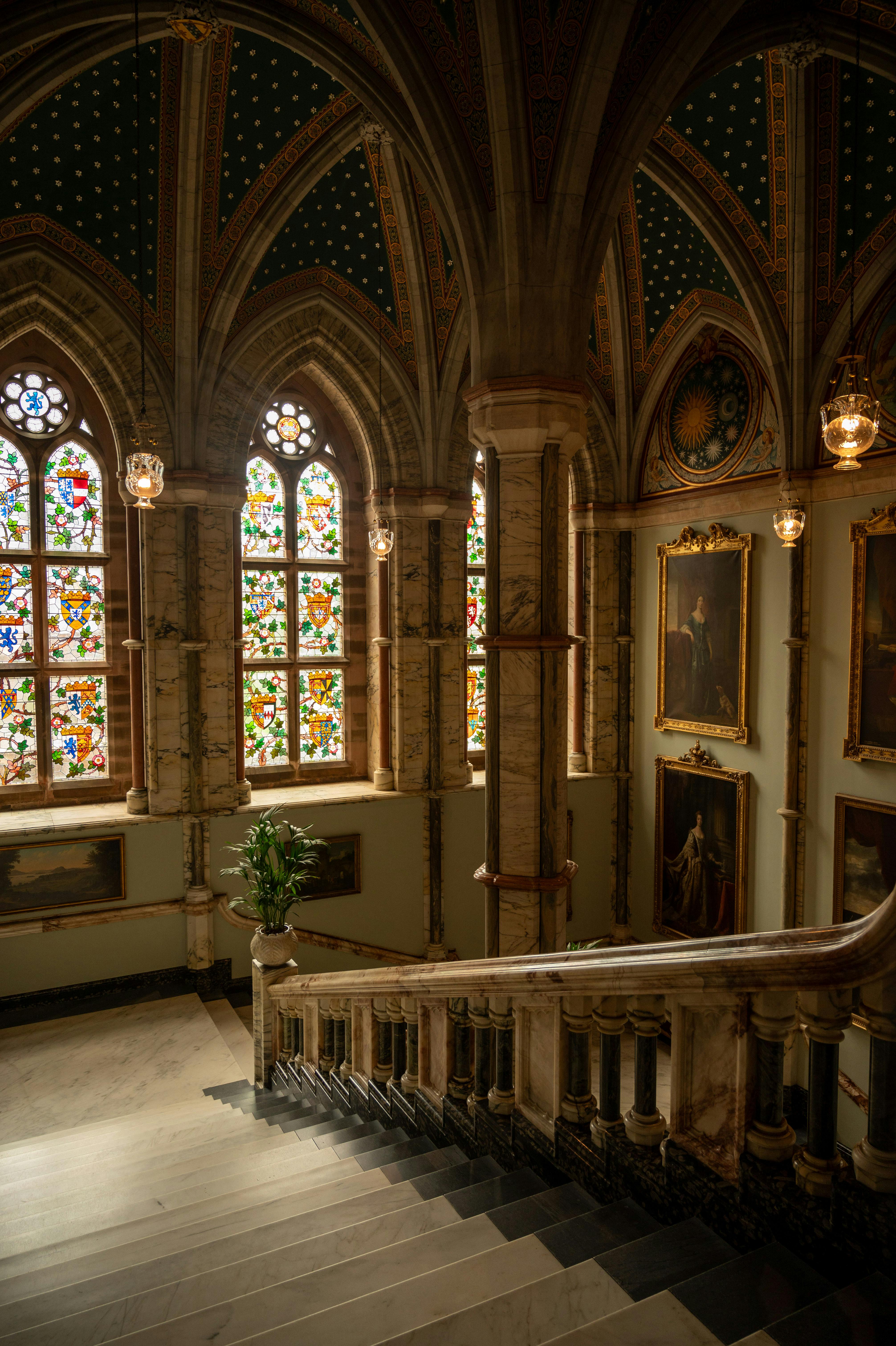 Neo-Gothic staircase with ornate stained glass windows in a historic Scottish building.