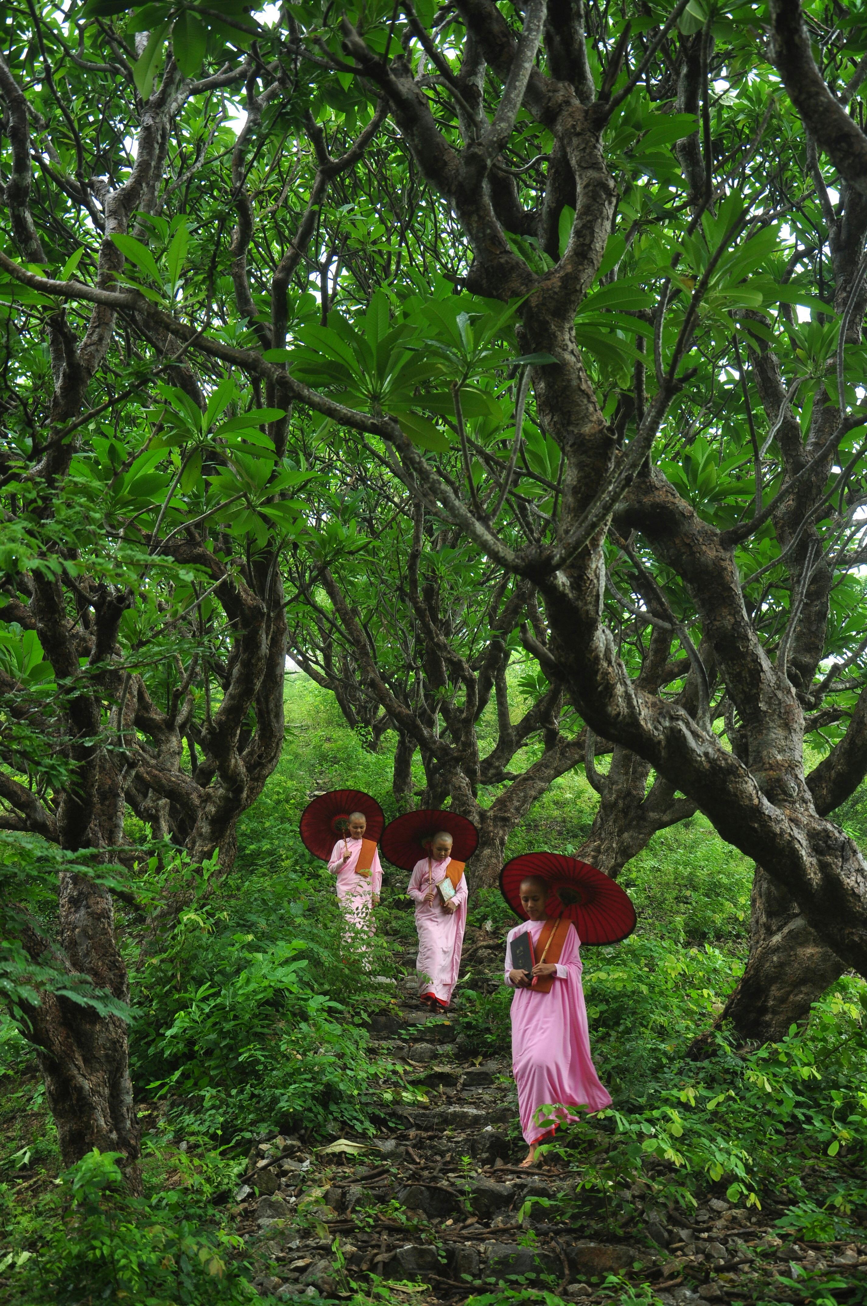Three Buddhist nuns in pink robes with umbrellas walk through lush green forest in Sagaing, Myanmar.