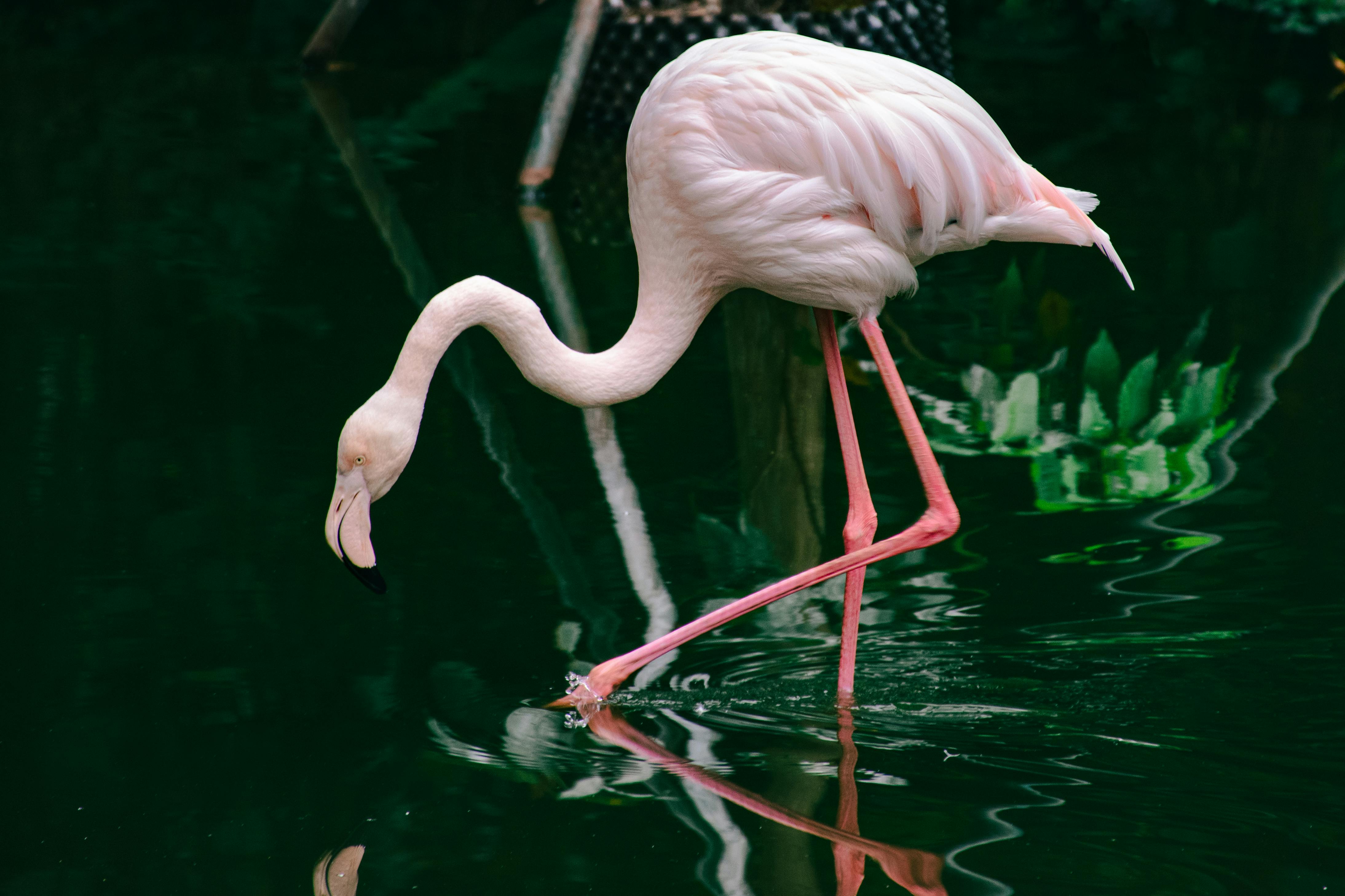 Graceful flamingo standing in serene water, reflecting its beauty. Captured in Guangzhou, China.