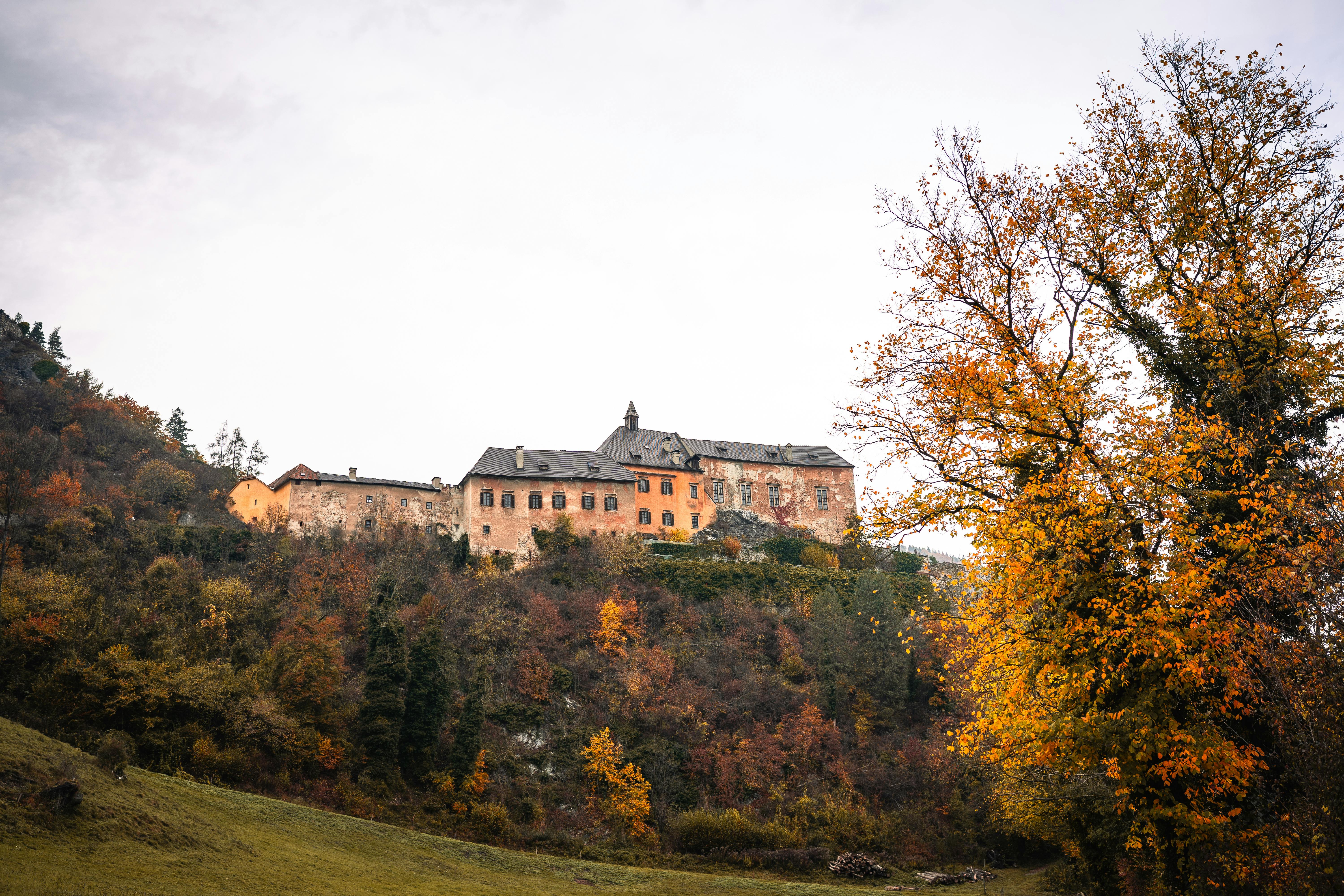 Picturesque view of a historic building surrounded by autumn foliage on a hilltop.