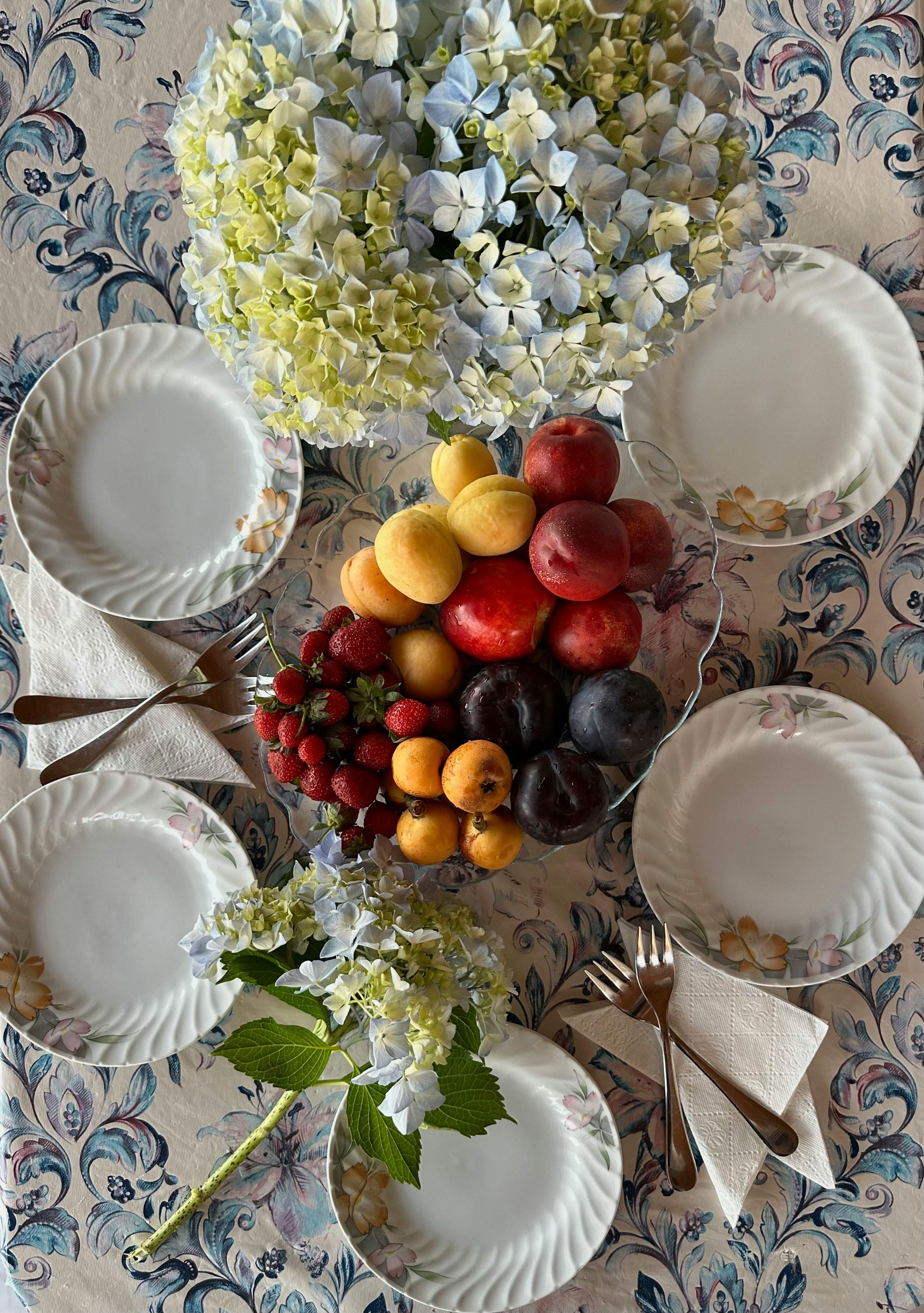Top view of a table setting with fruits, hydrangeas, and elegant plate arrangements.