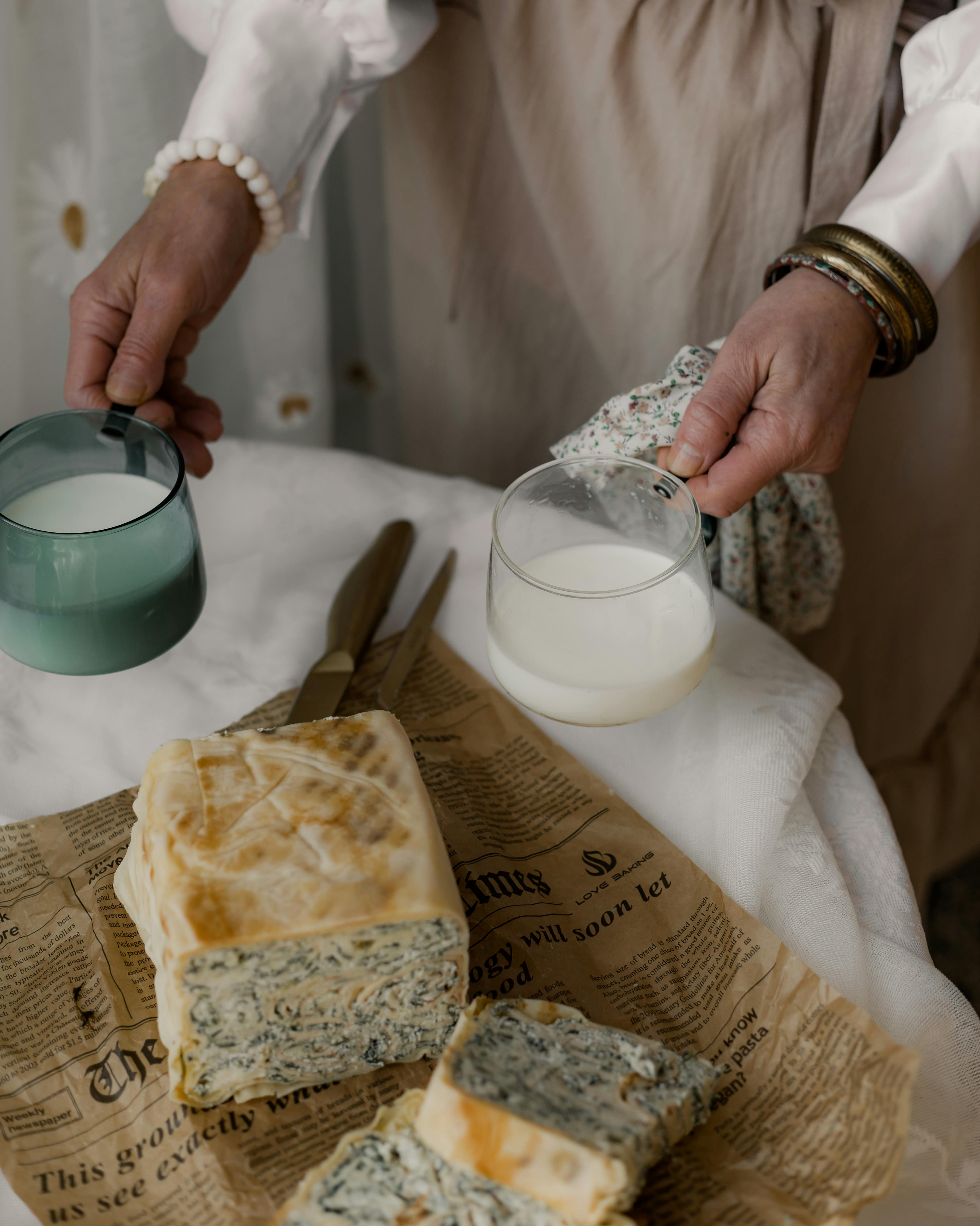 A cozy homemade breakfast setup with fresh pastry and milk, styled in a rustic aesthetic