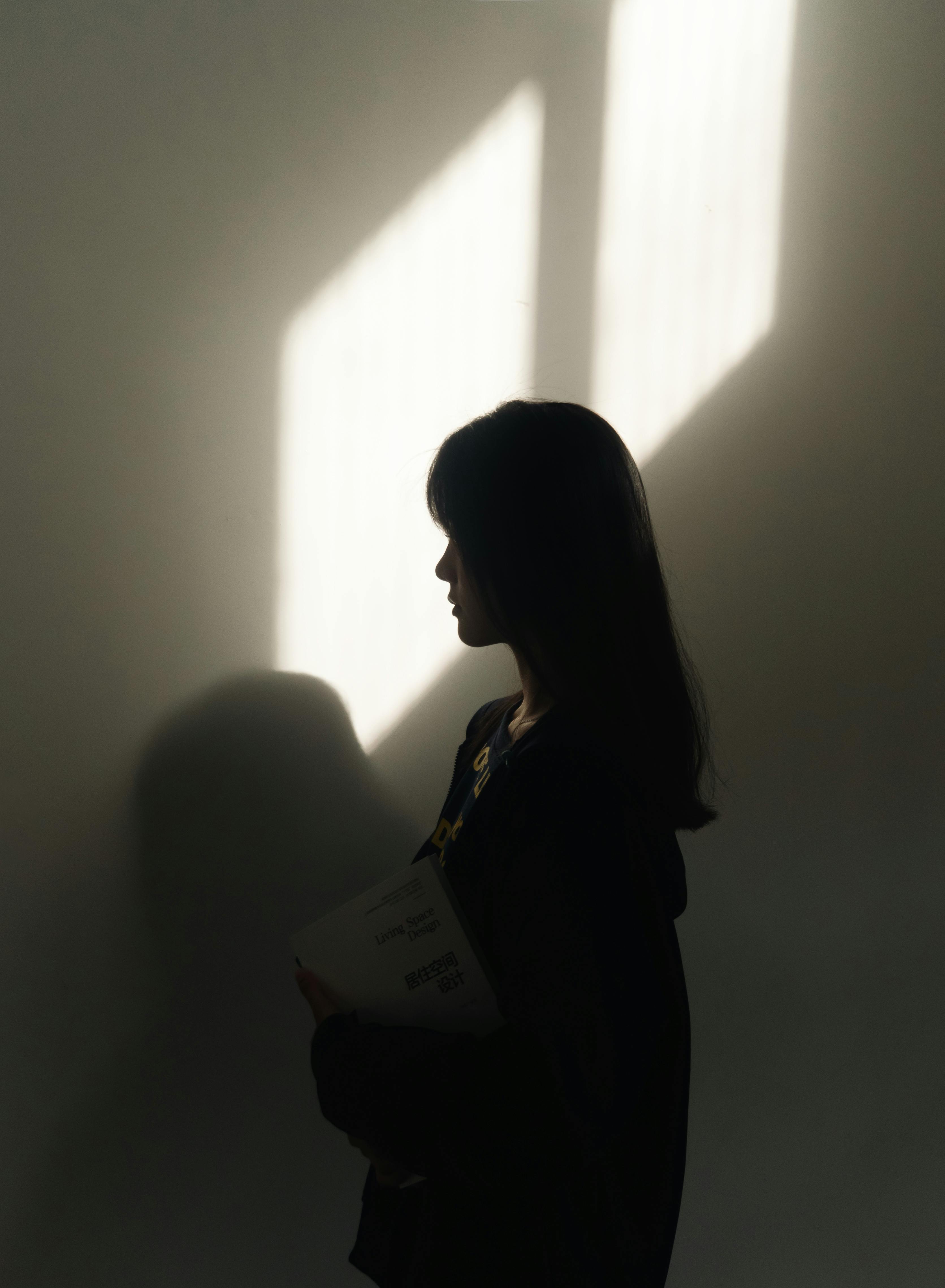 A moody silhouette of a woman standing against a wall with dramatic lighting and shadows.