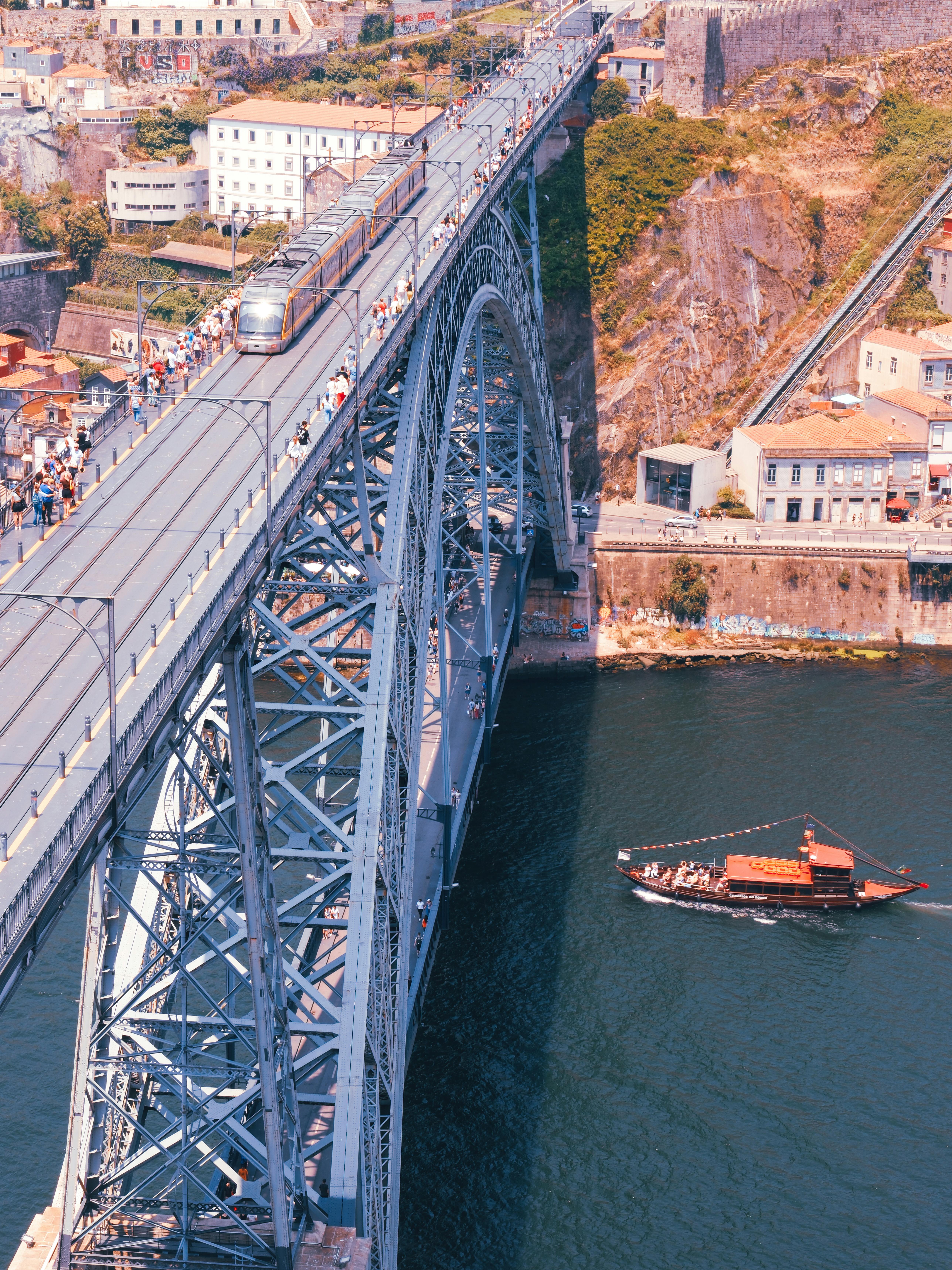 Aerial view of the iconic Dom Luís I Bridge and Douro River in Porto, Portugal.