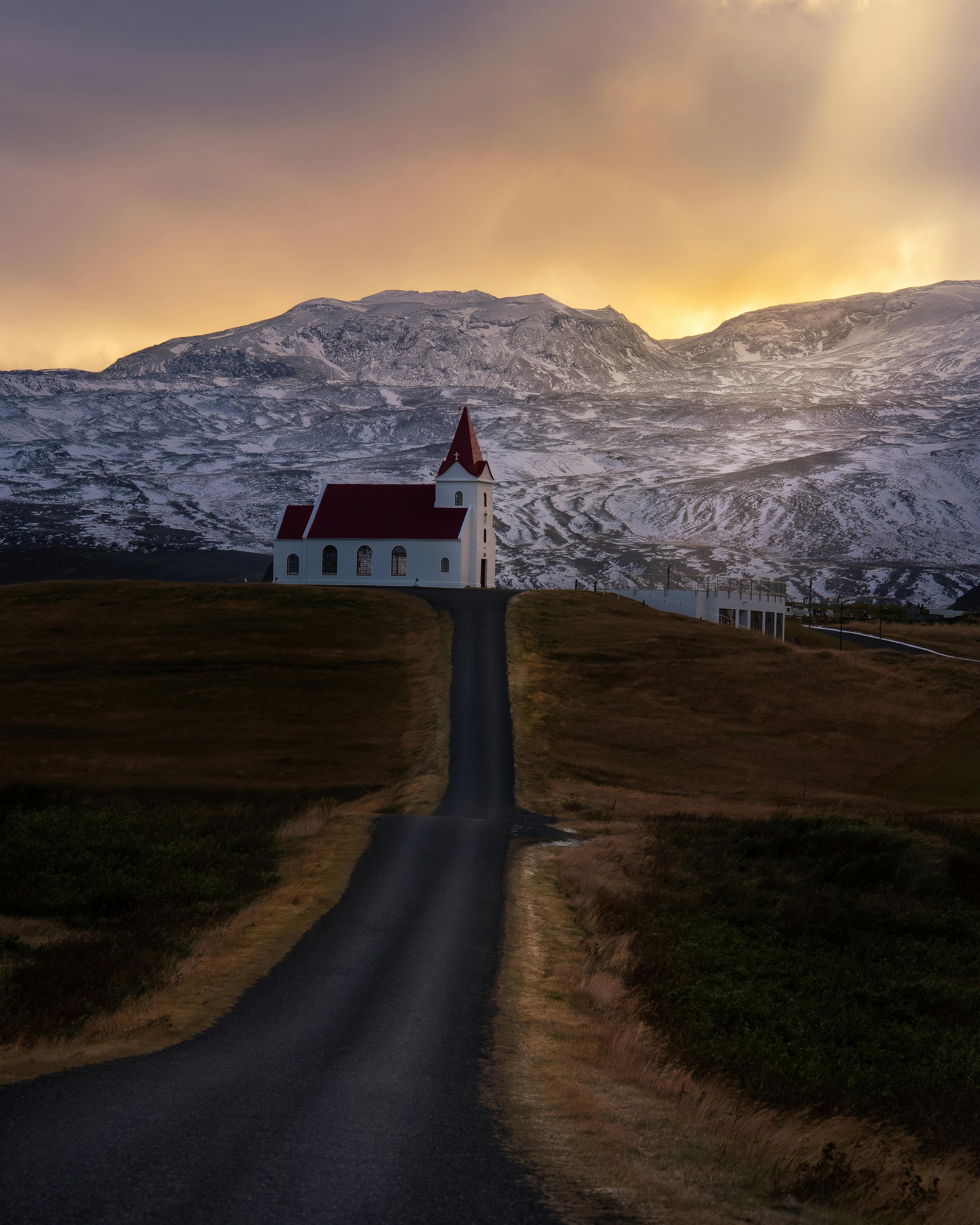A picturesque church with red roof stands amid a stunning sunset and snow-capped mountains.