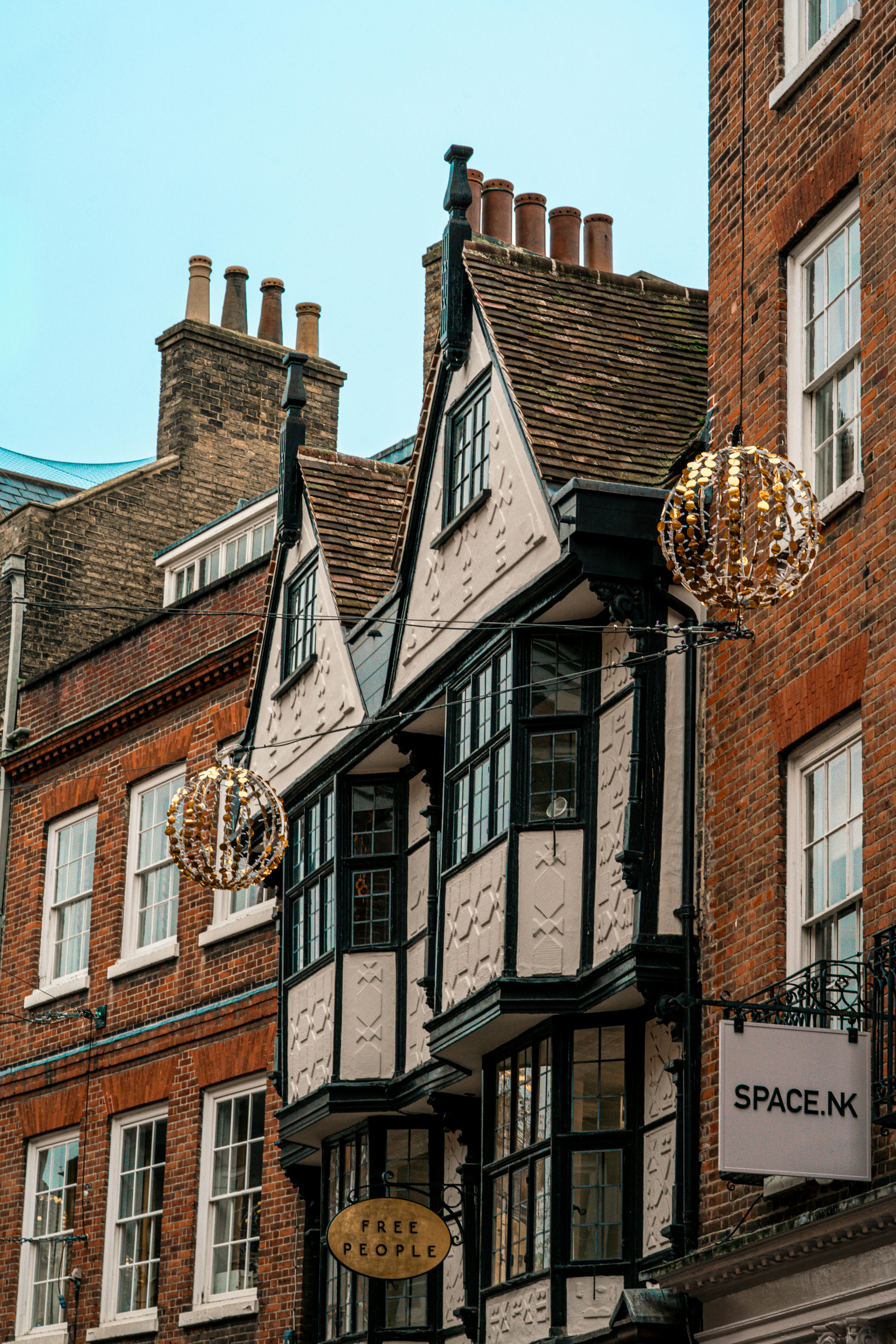 A vibrant street with historic architecture showcasing charming old buildings and festive decorations.