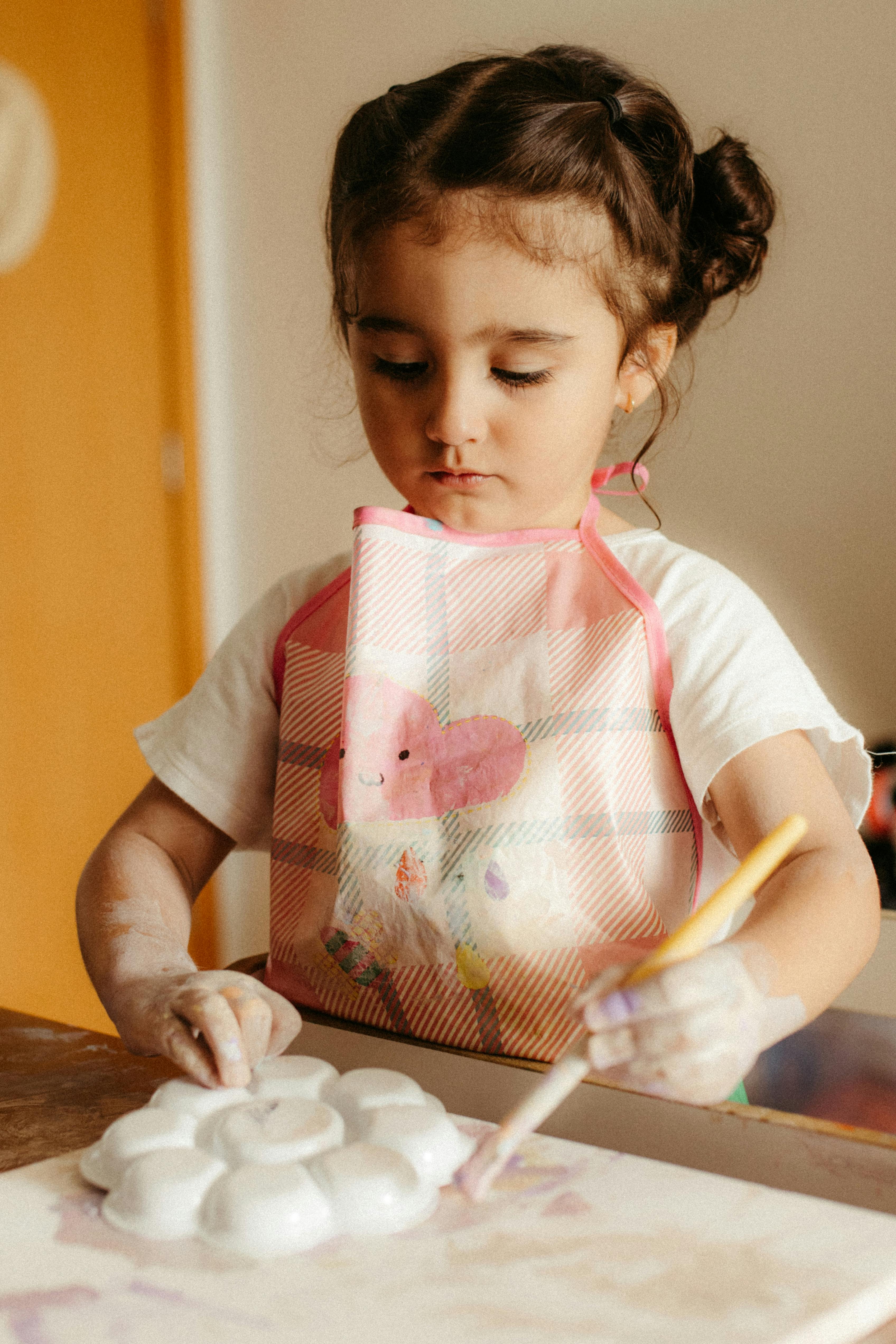 A little girl paints a plaster mold indoors, wearing a pink apron. Ideal for art and education themes.
