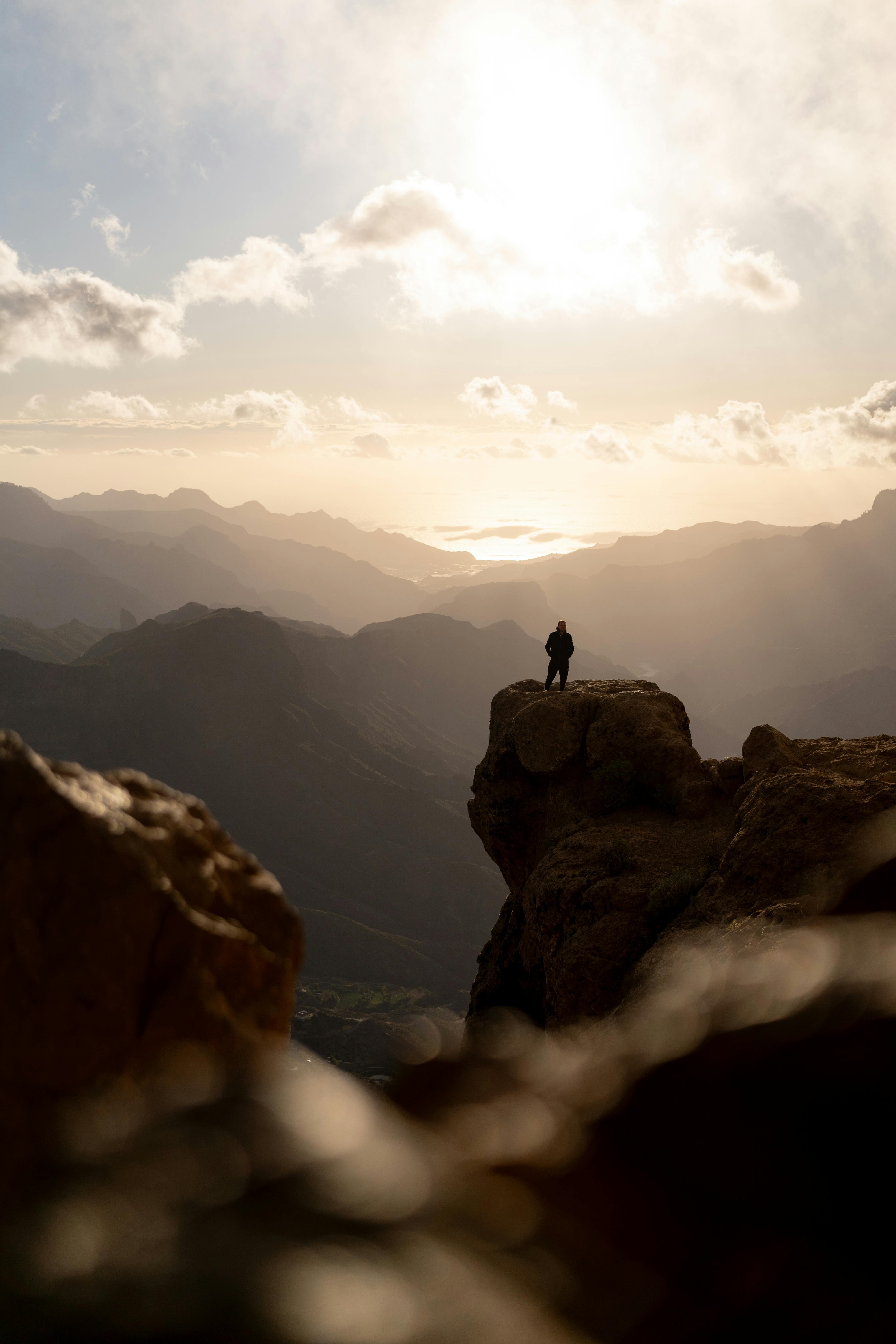 Silhouette of a hiker on a mountain cliff at sunrise, capturing a stunning landscape view.