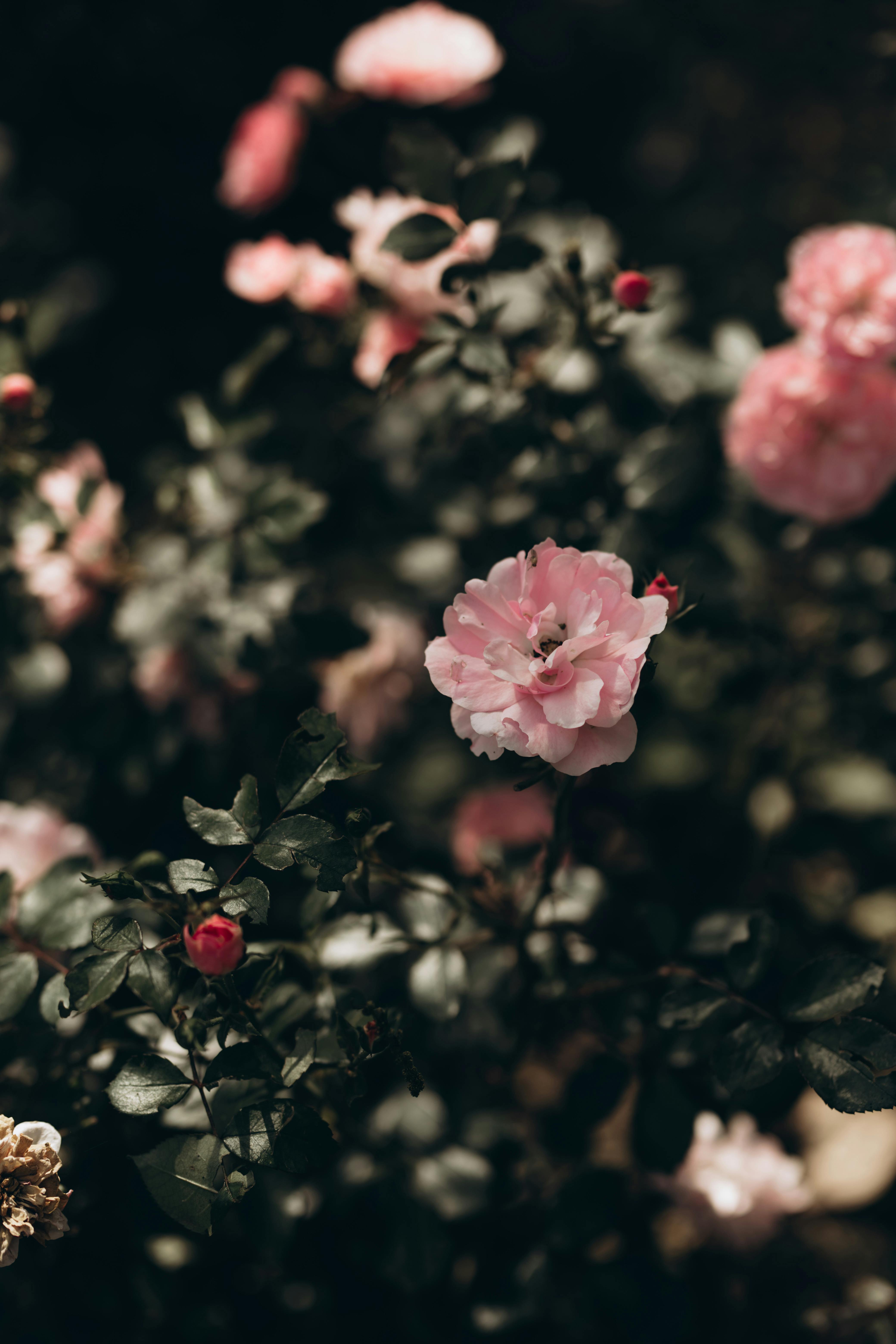 A close-up of delicate pink roses blooming in a lush garden with soft, natural light