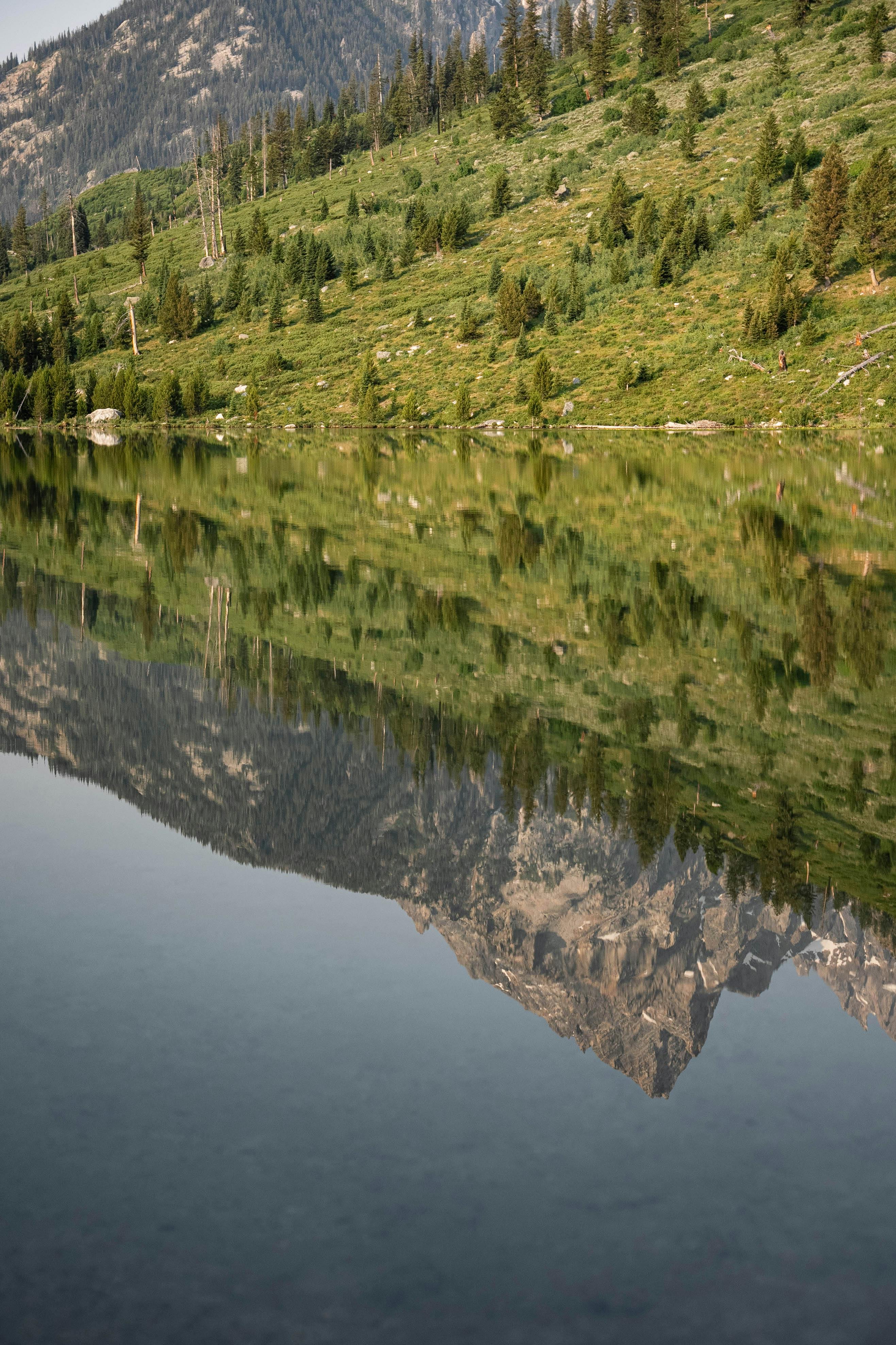 Serene reflection of mountains and trees in a tranquil lake in Jackson, Wyoming.