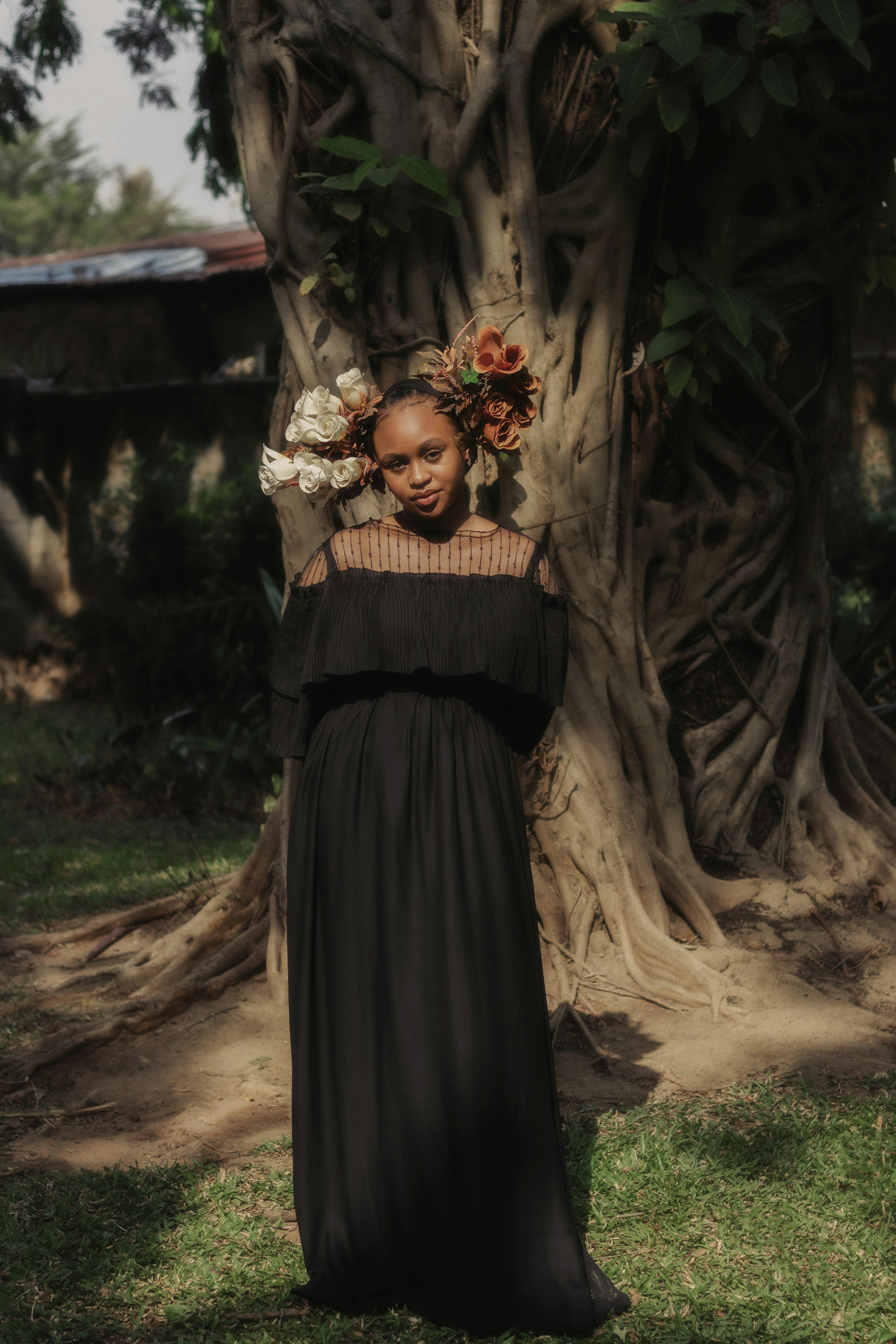 Elegant portrait of a woman in a black dress standing by a tree in Abuja, Nigeria.