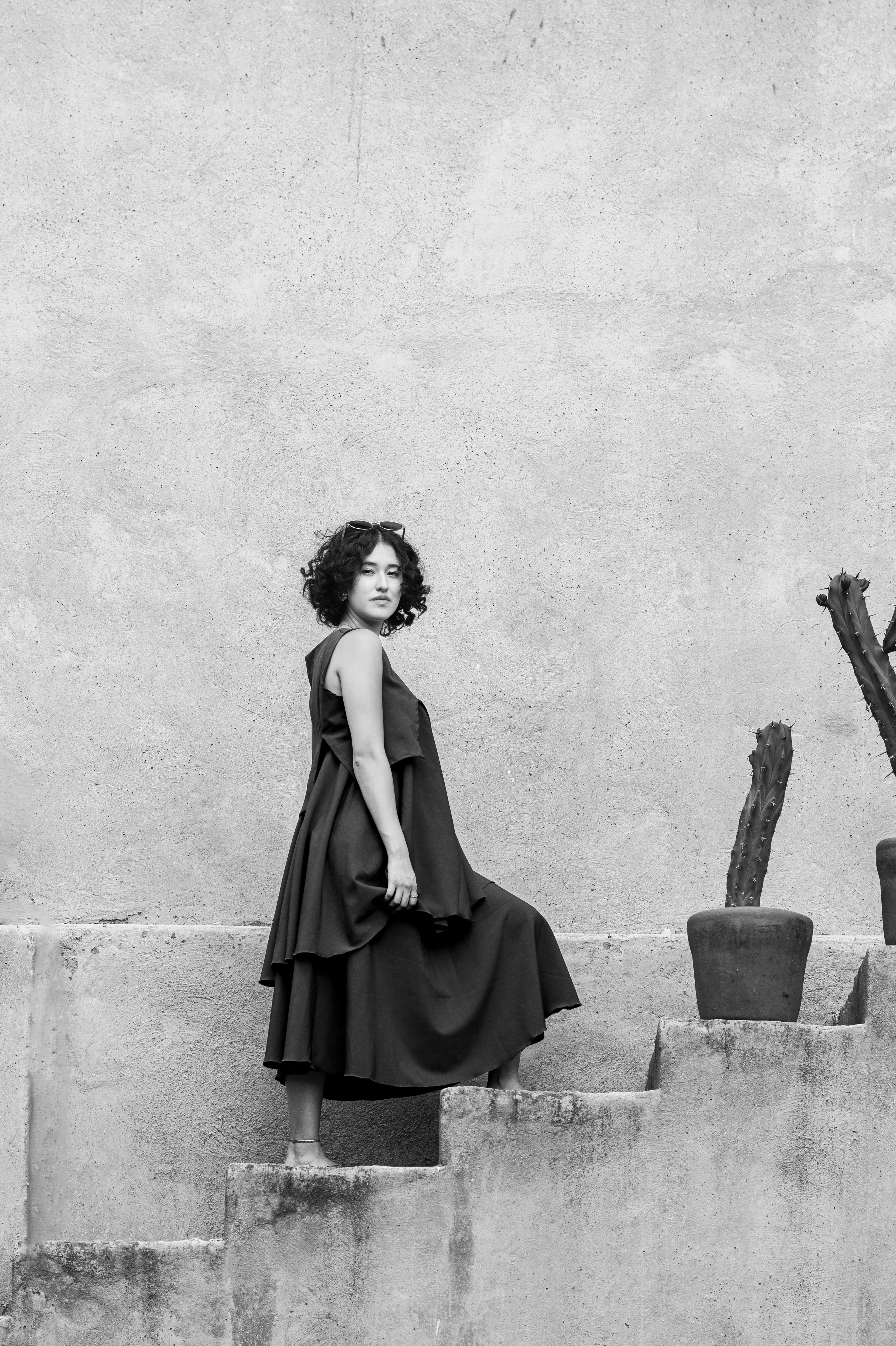 Black and white photo of a stylish woman on stairs in a minimalist setting.