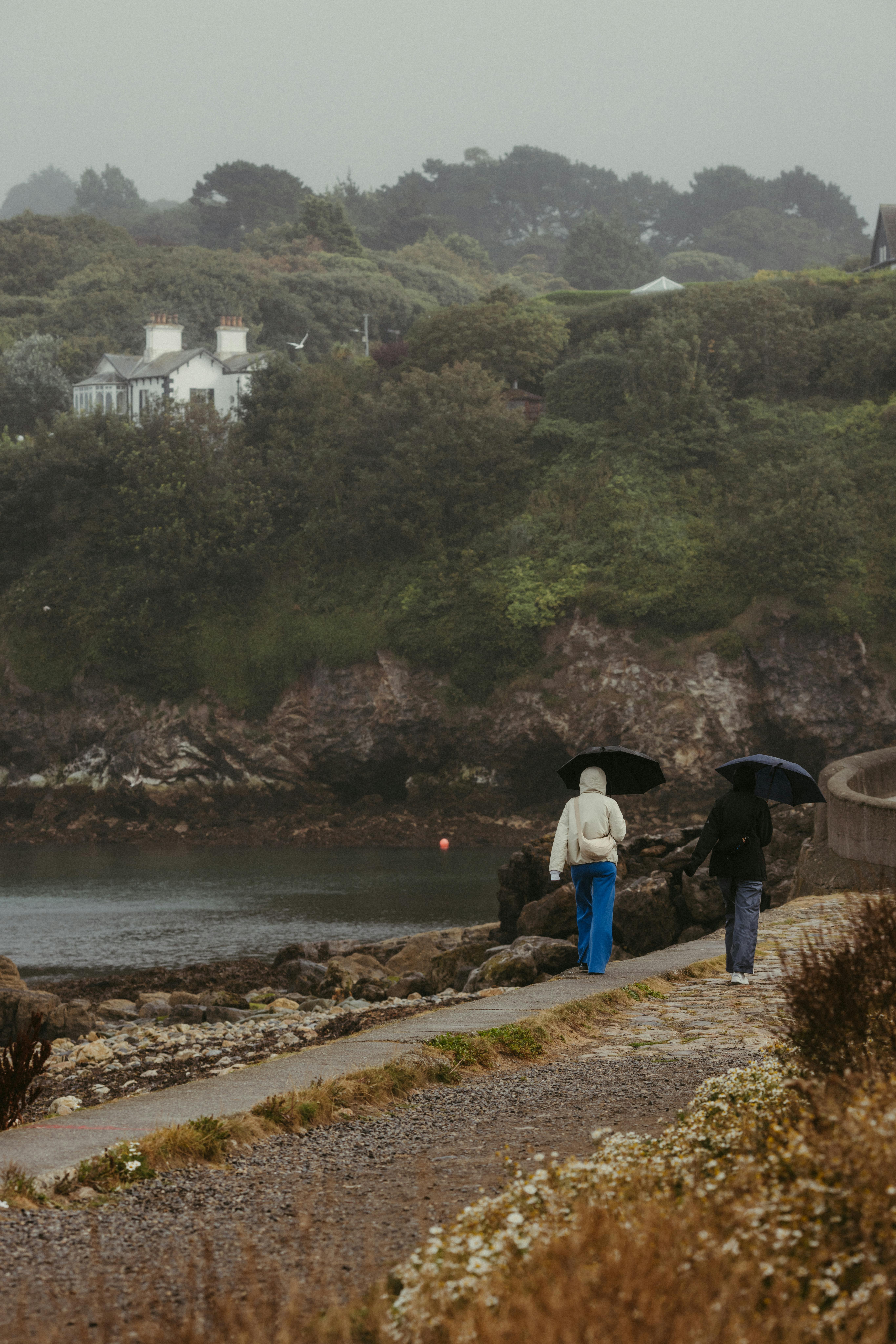 Two people walk with umbrellas on a rainy day near a coastal path in Howth, Dublin.