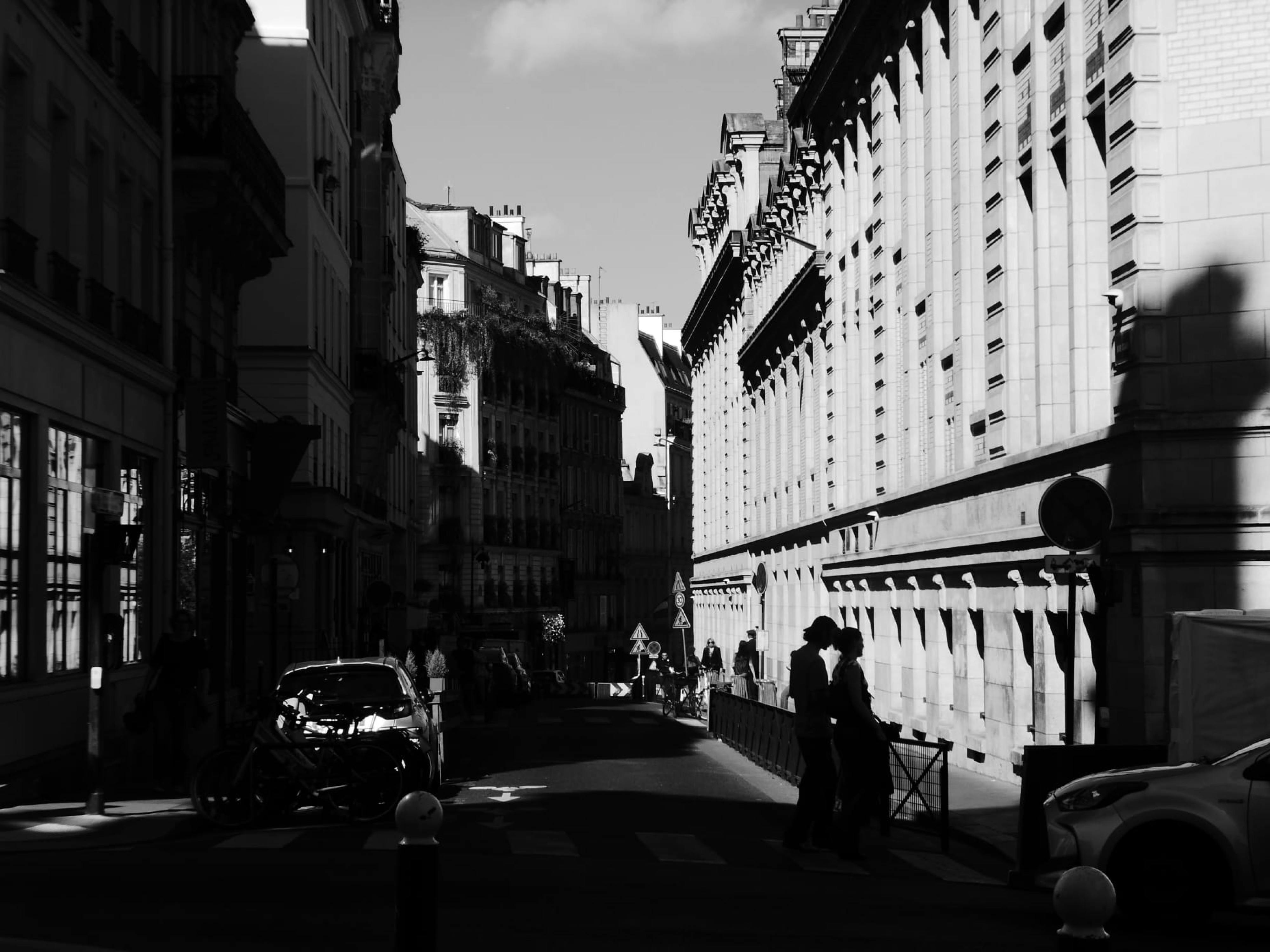 Charming black and white street scene showcasing Paris's architectural elegance.