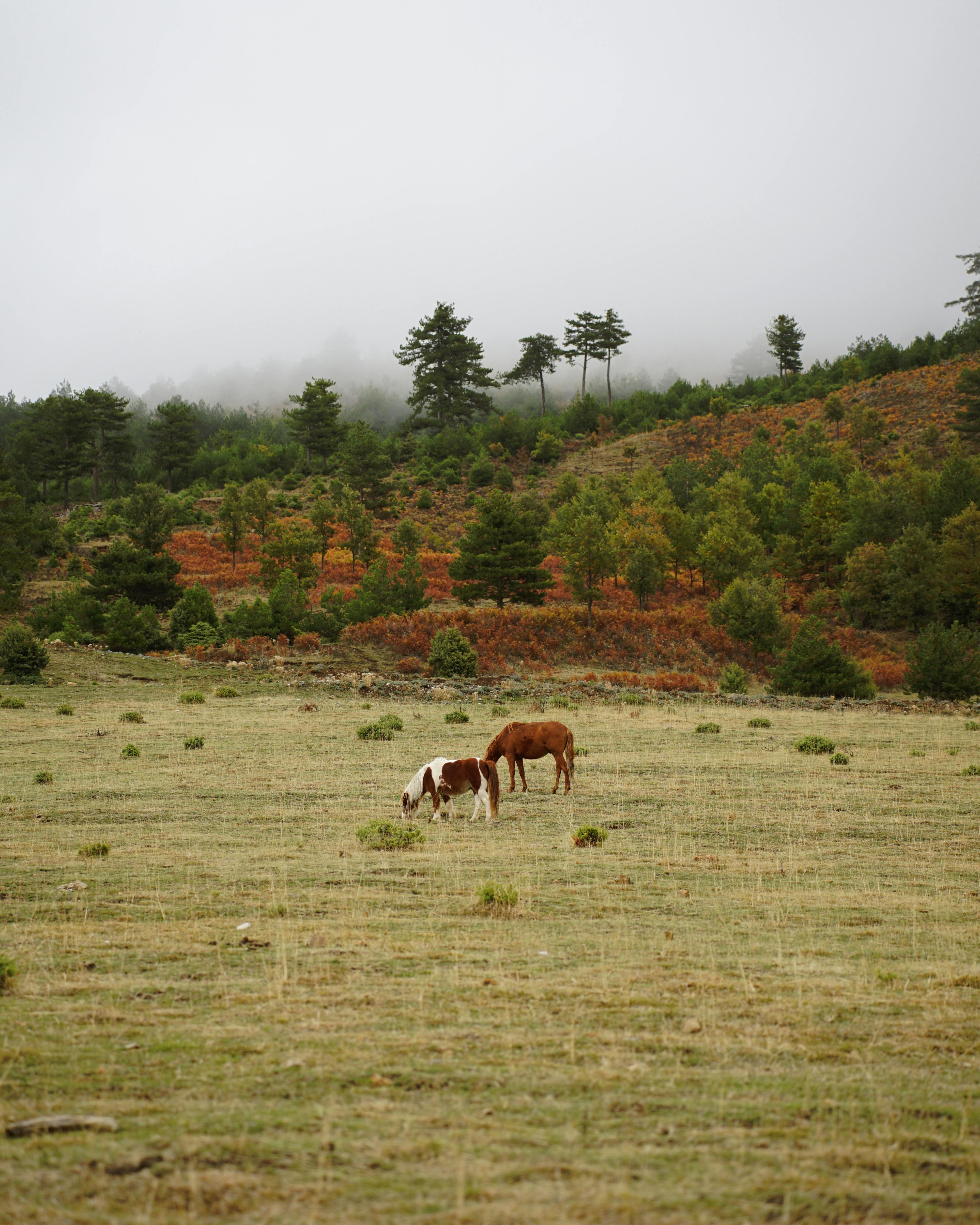 Peaceful scene of two horses grazing in a meadow with a misty forest backdrop in Gramsh, Albania.