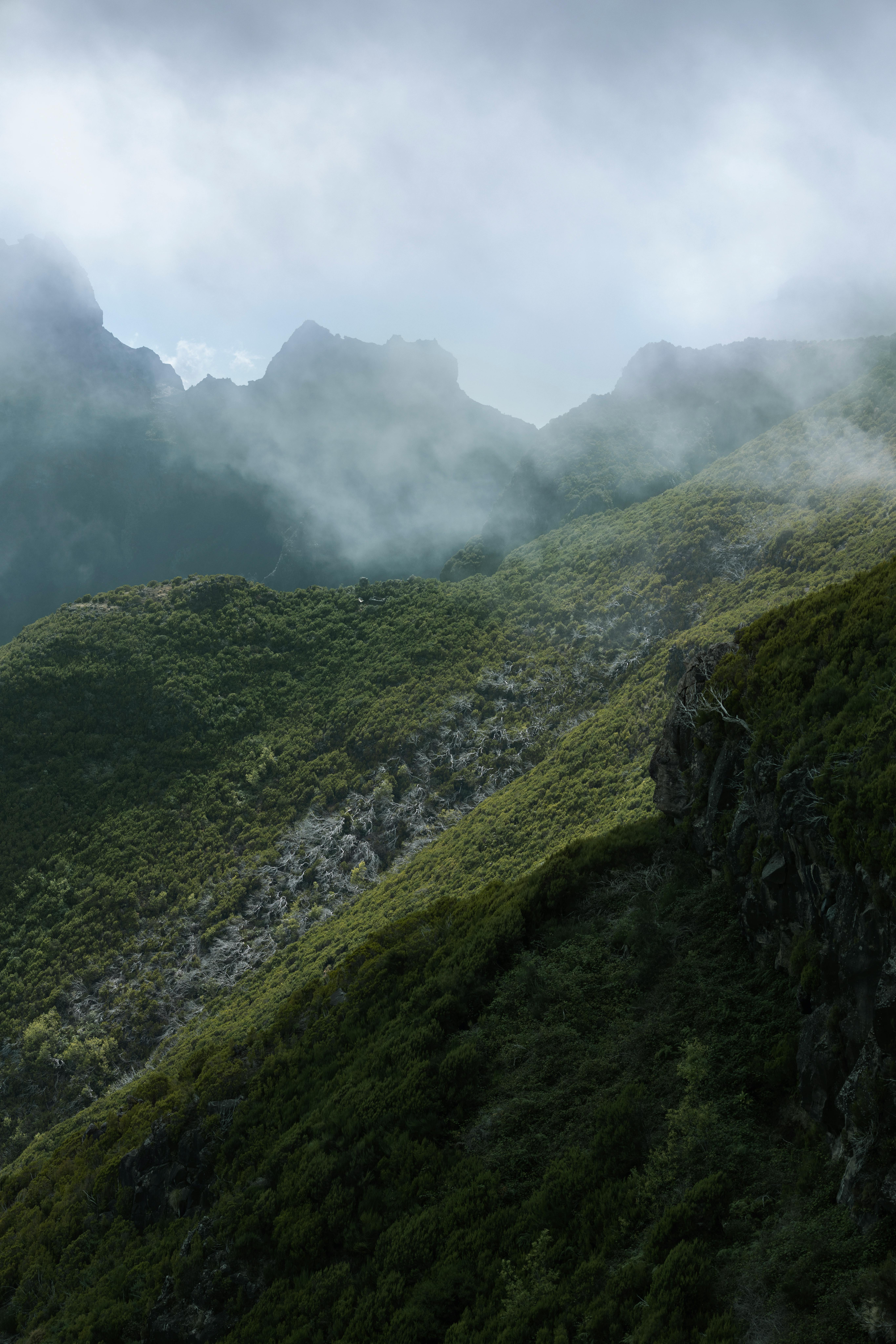 Scenic misty mountains in Madeira, Portugal showcasing lush greenery and rugged terrain.