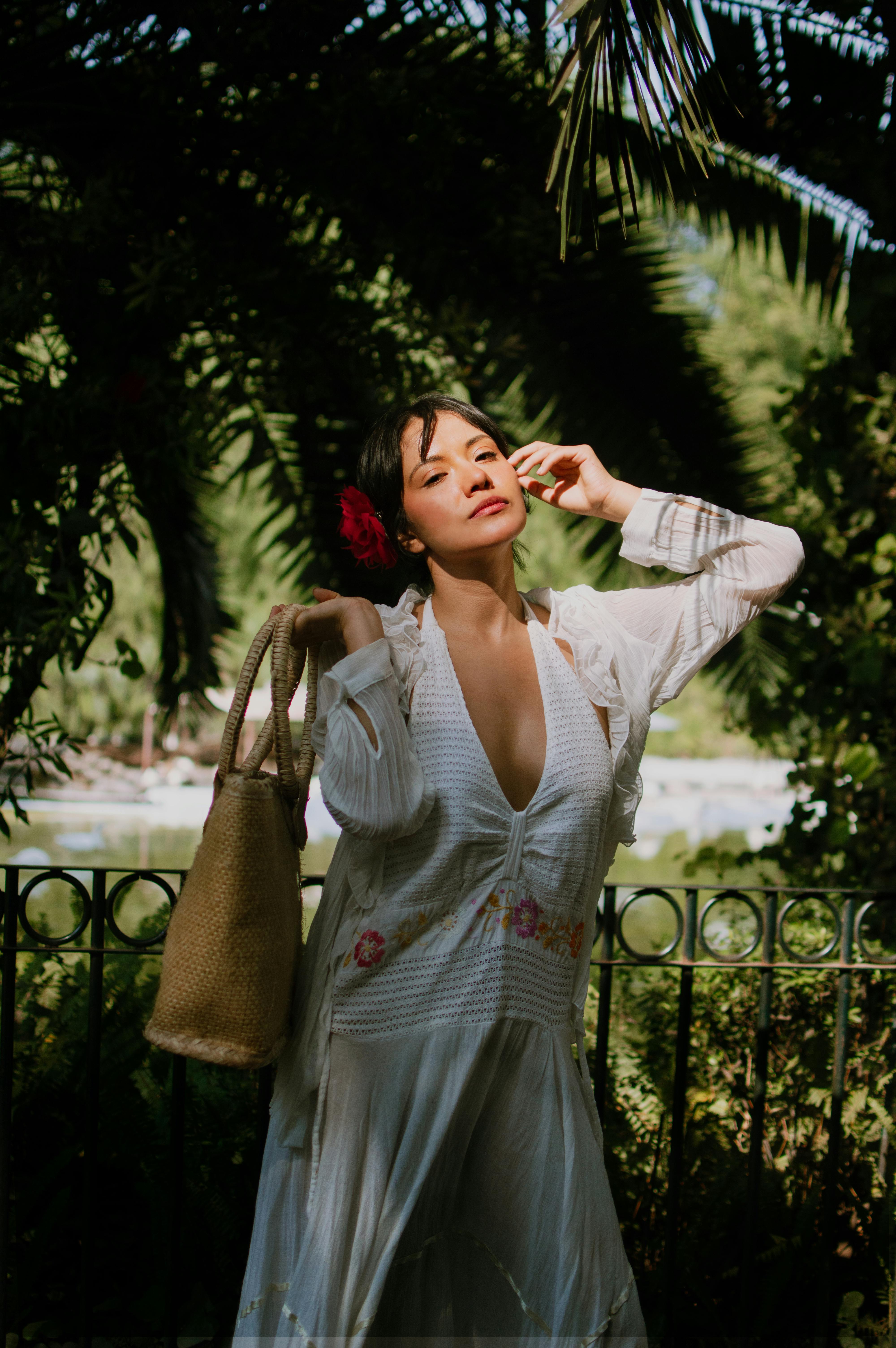An elegant woman in a flowing dress poses gracefully under lush greenery in Mexico City.