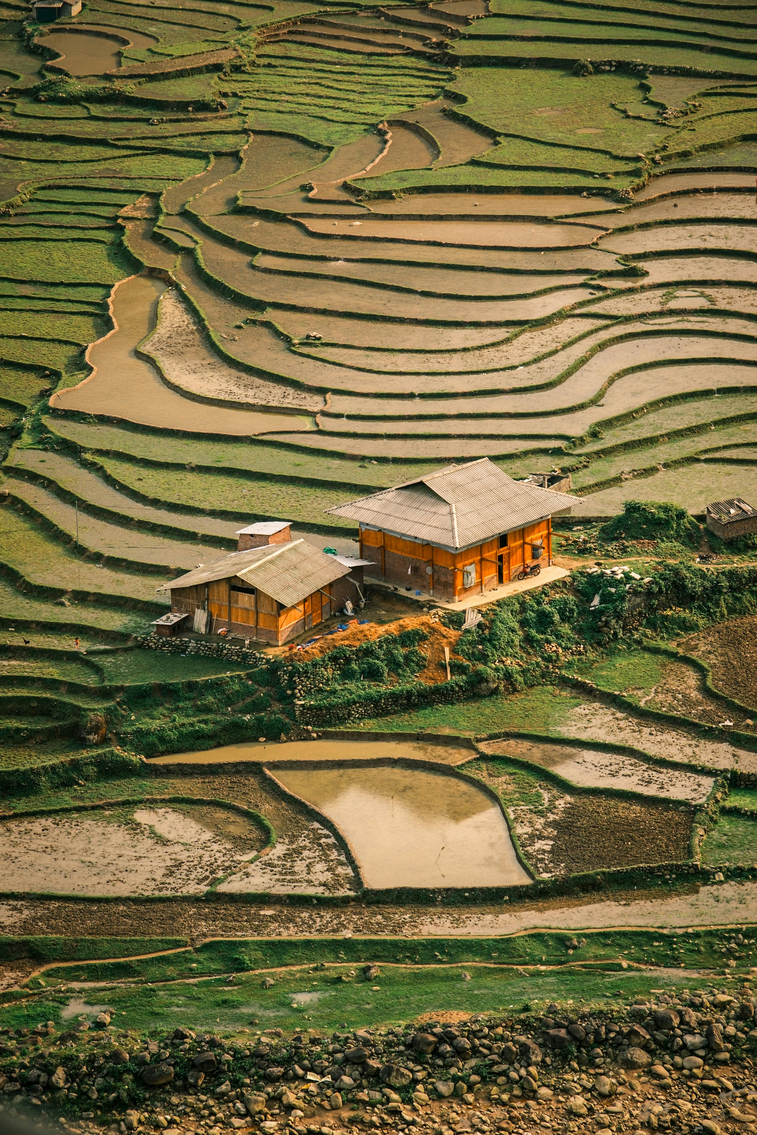 Aerial view of traditional houses amidst lush rice terraces under golden sunlight.