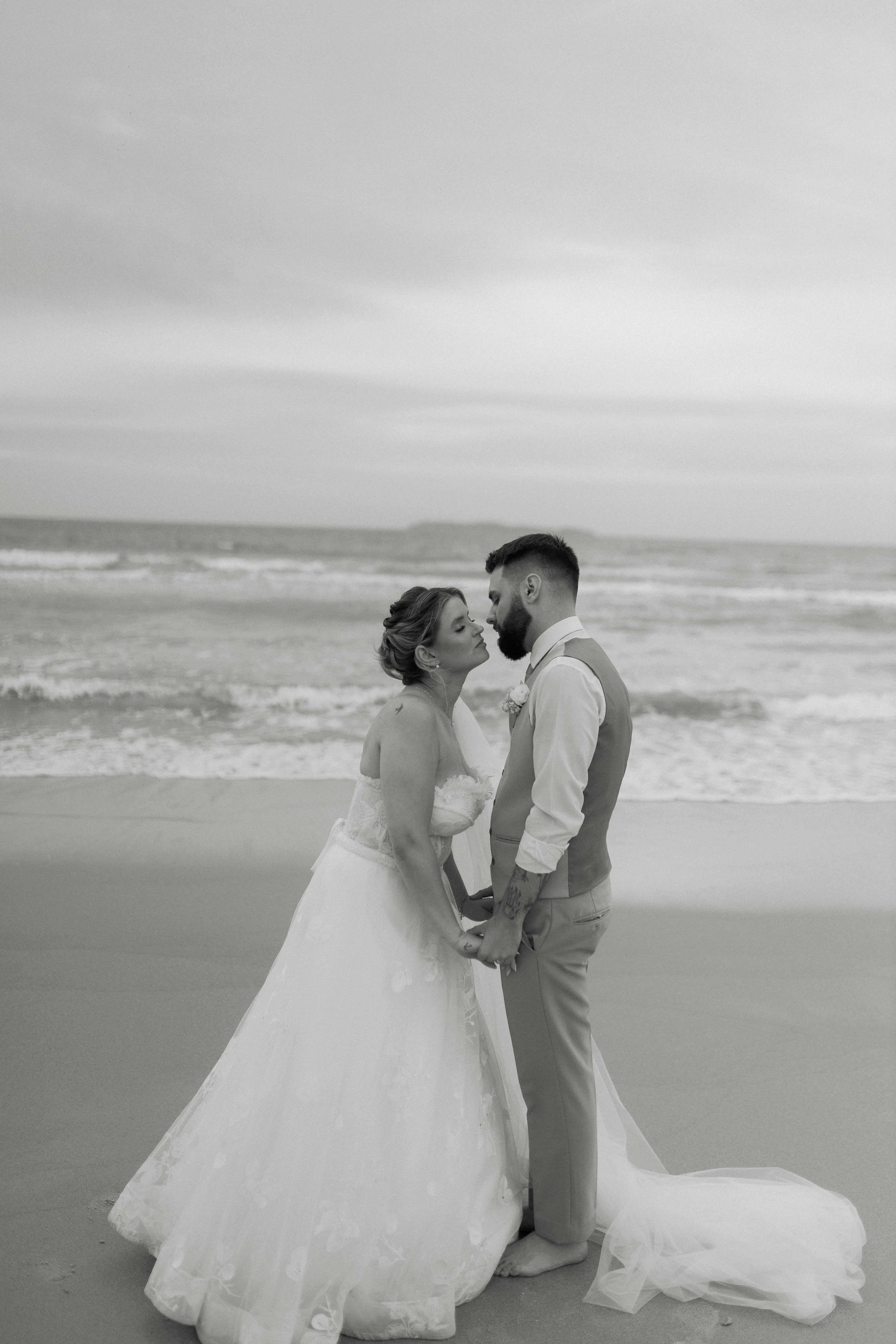 A couple shares a tender kiss on a beach during their wedding at sunset.