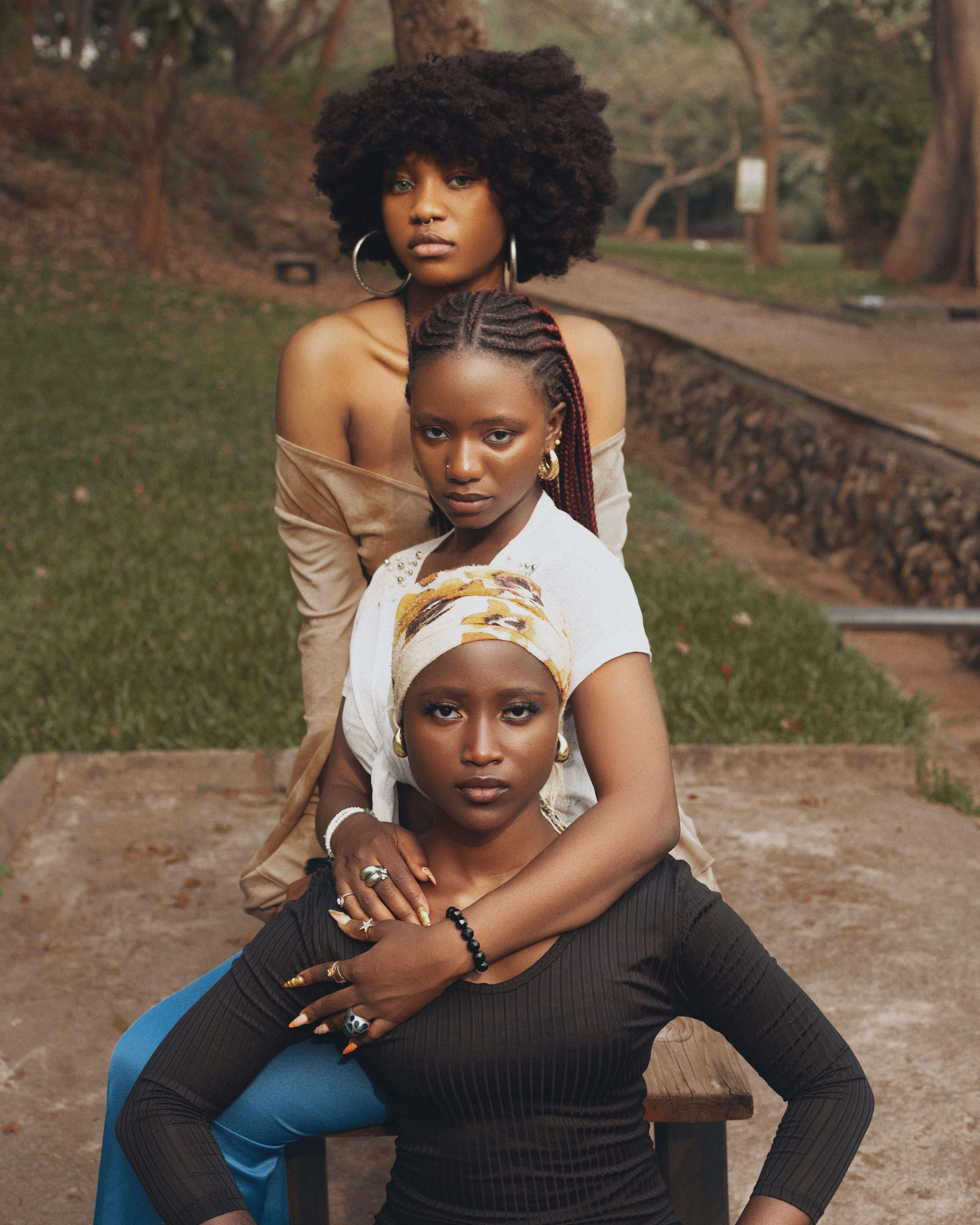 Stylish portrait of three black women posing elegantly outdoors in a serene park setting.