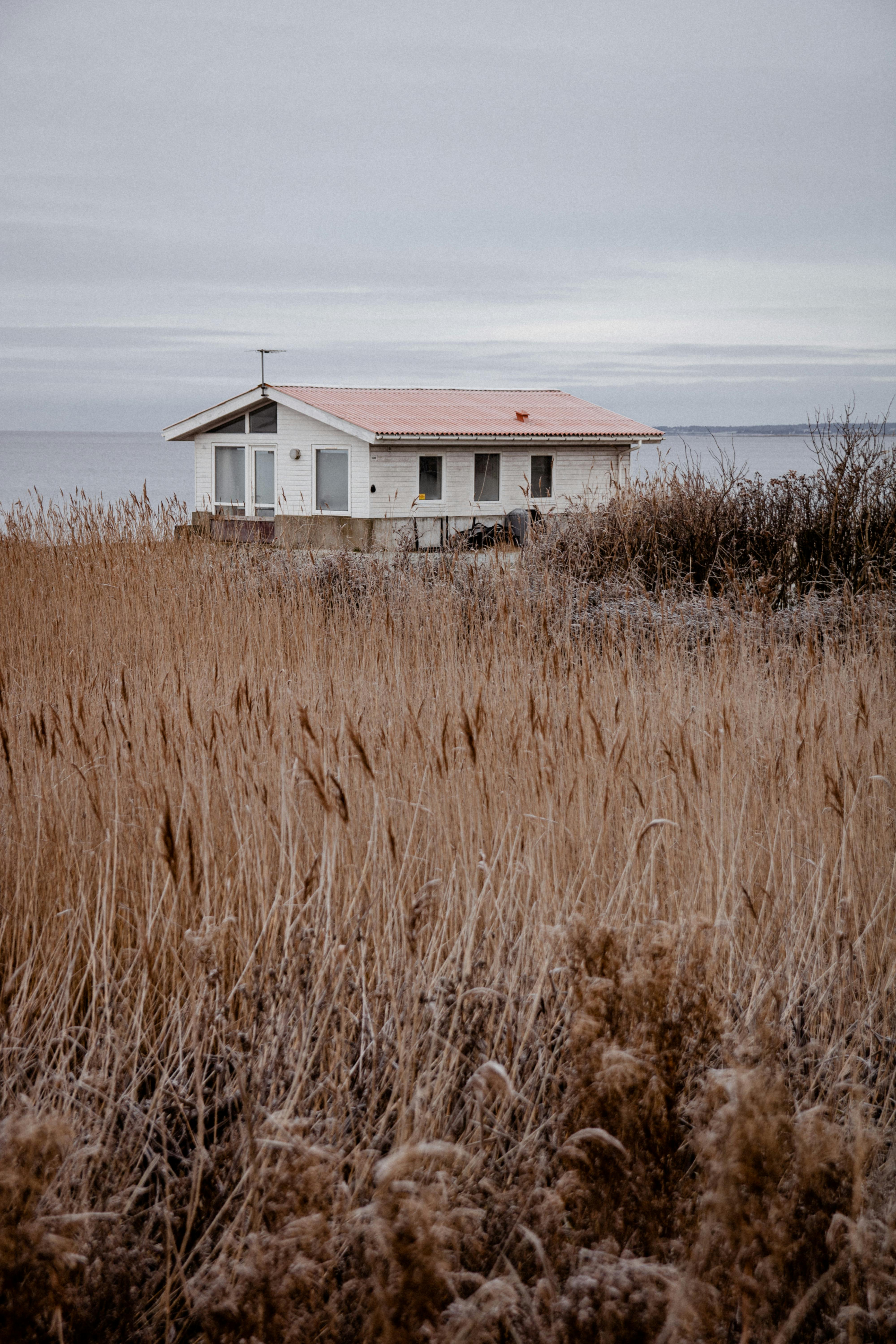 A solitary cabin nestled by the Danish coast in Hvalpsund during winter. Serene and moody tones.