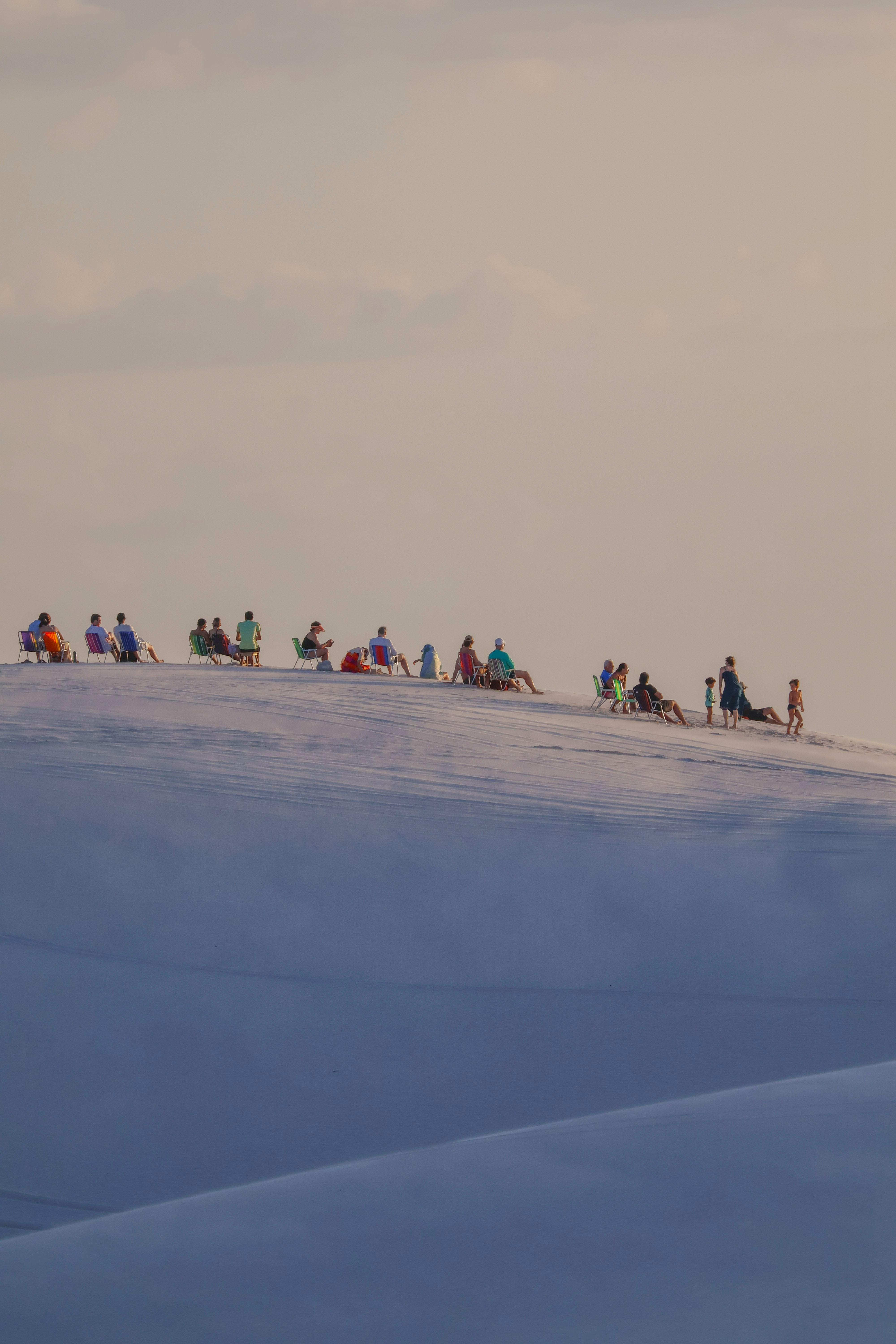 A group of tourists relishing the sunset on the dunes of Lençóis Maranhenses in Maranhão, Brazil.