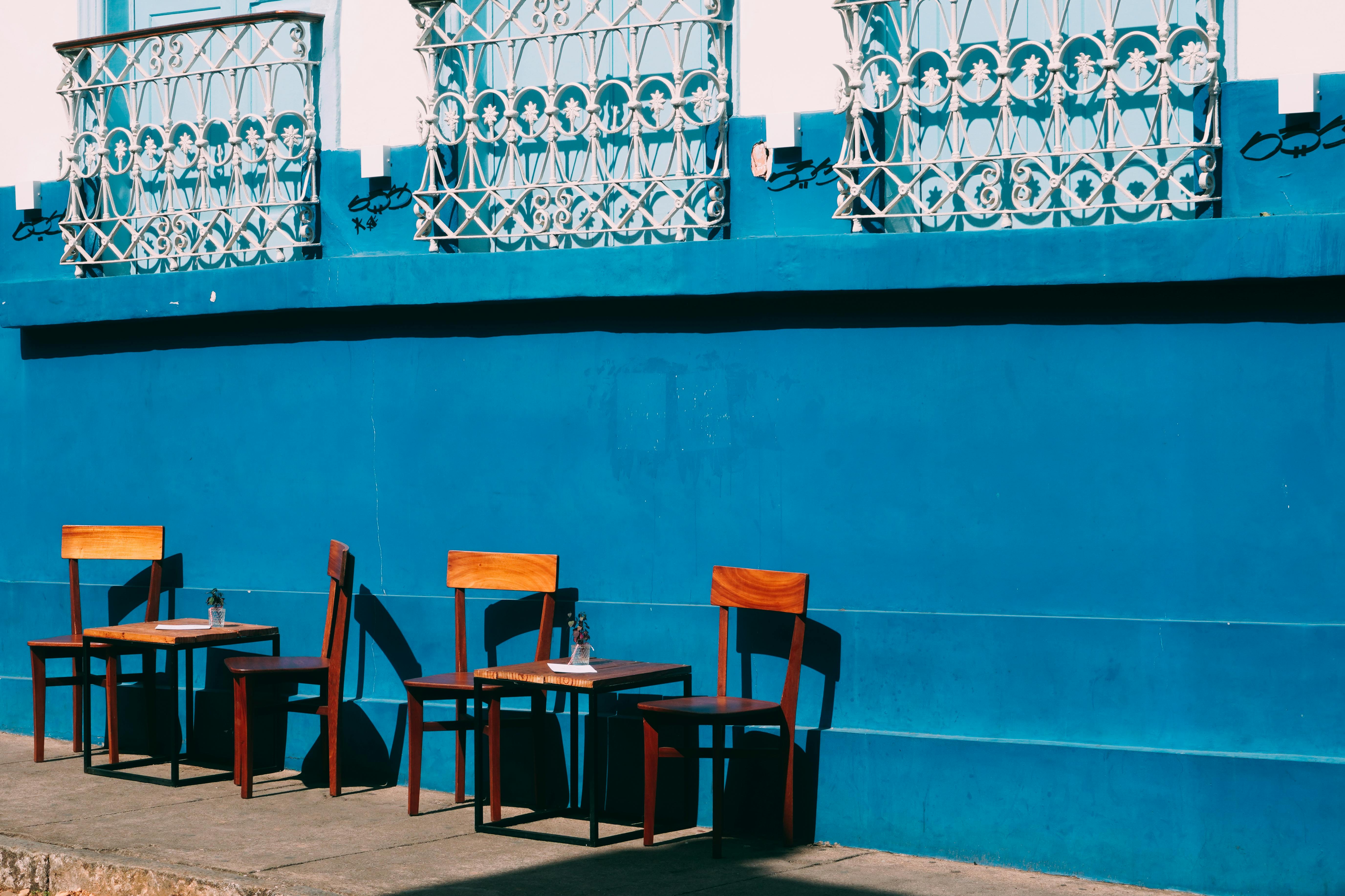 An outdoor cafe with wooden chairs and a blue wall under ornate windows in bright sunlight.