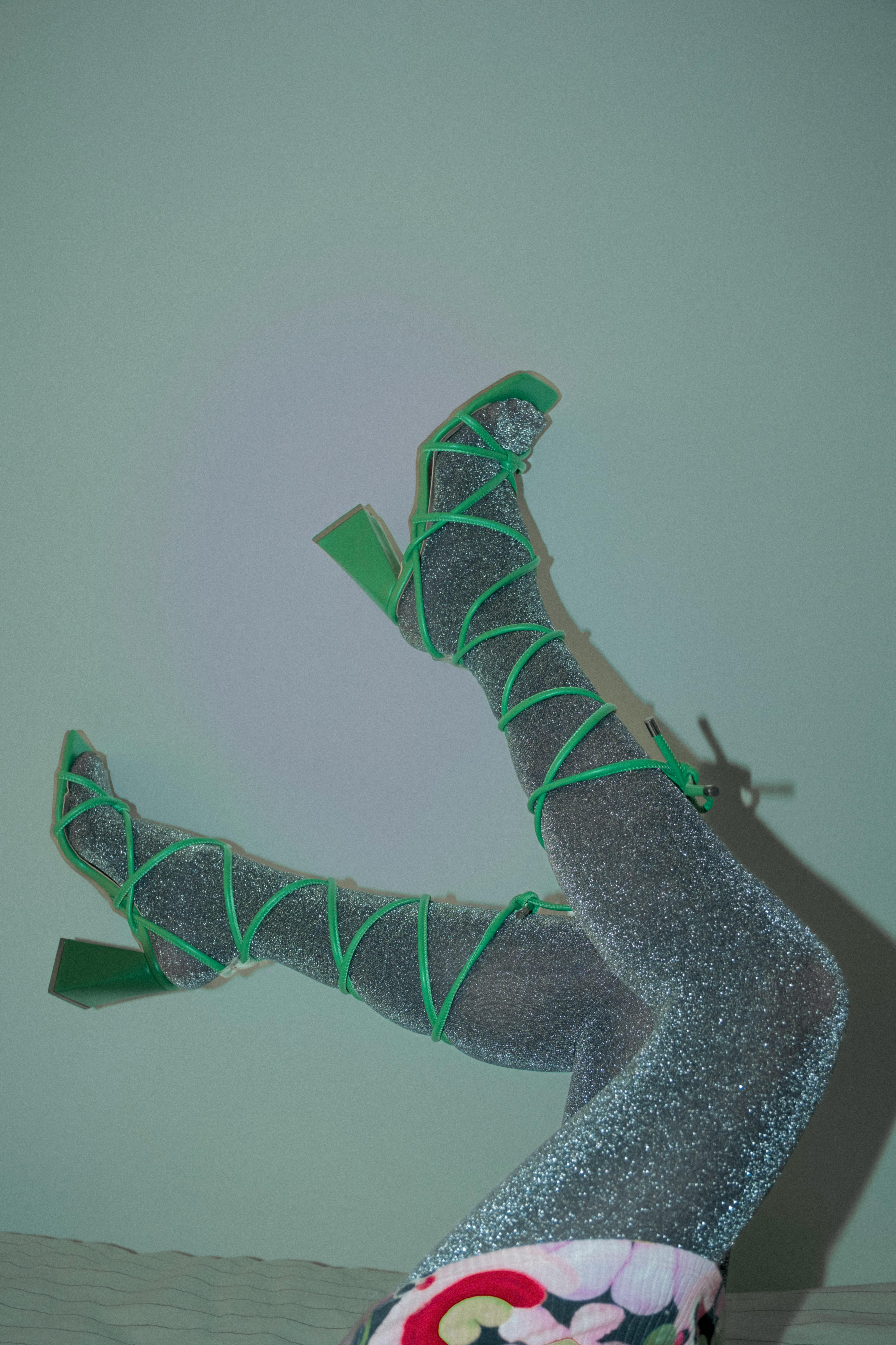 A creative fashion shot featuring green heels and glittery hose, emphasizing style and modern design.