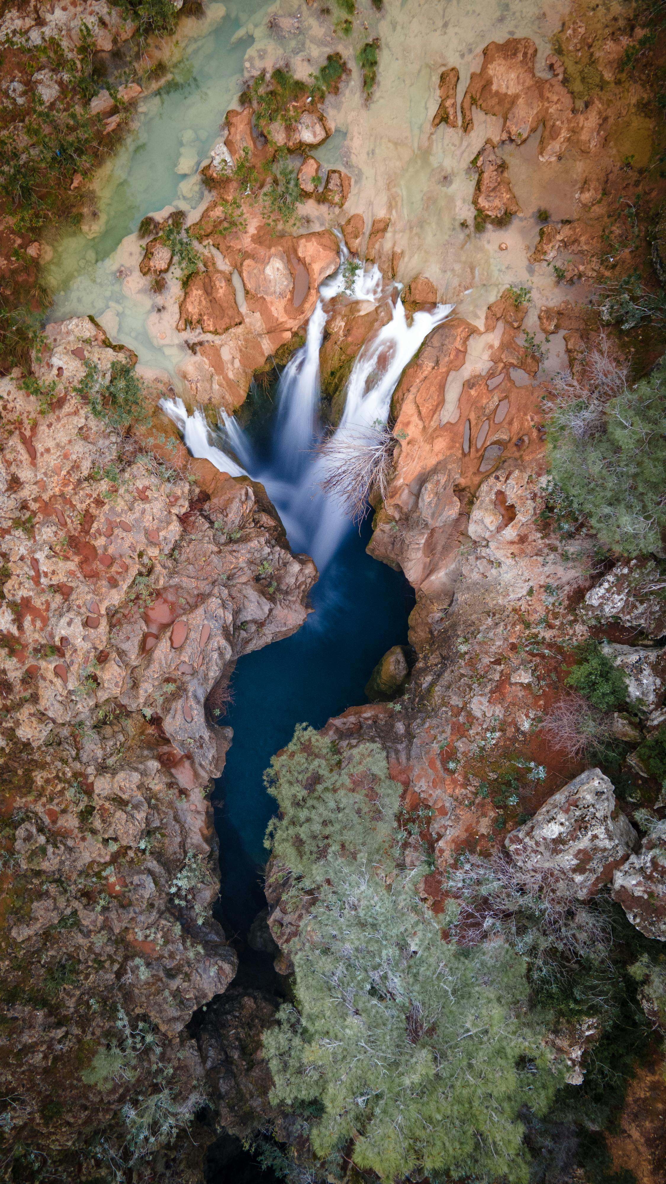 Drone shot of a picturesque waterfall surrounded by rocky terrain in Antalya, Türkiye.