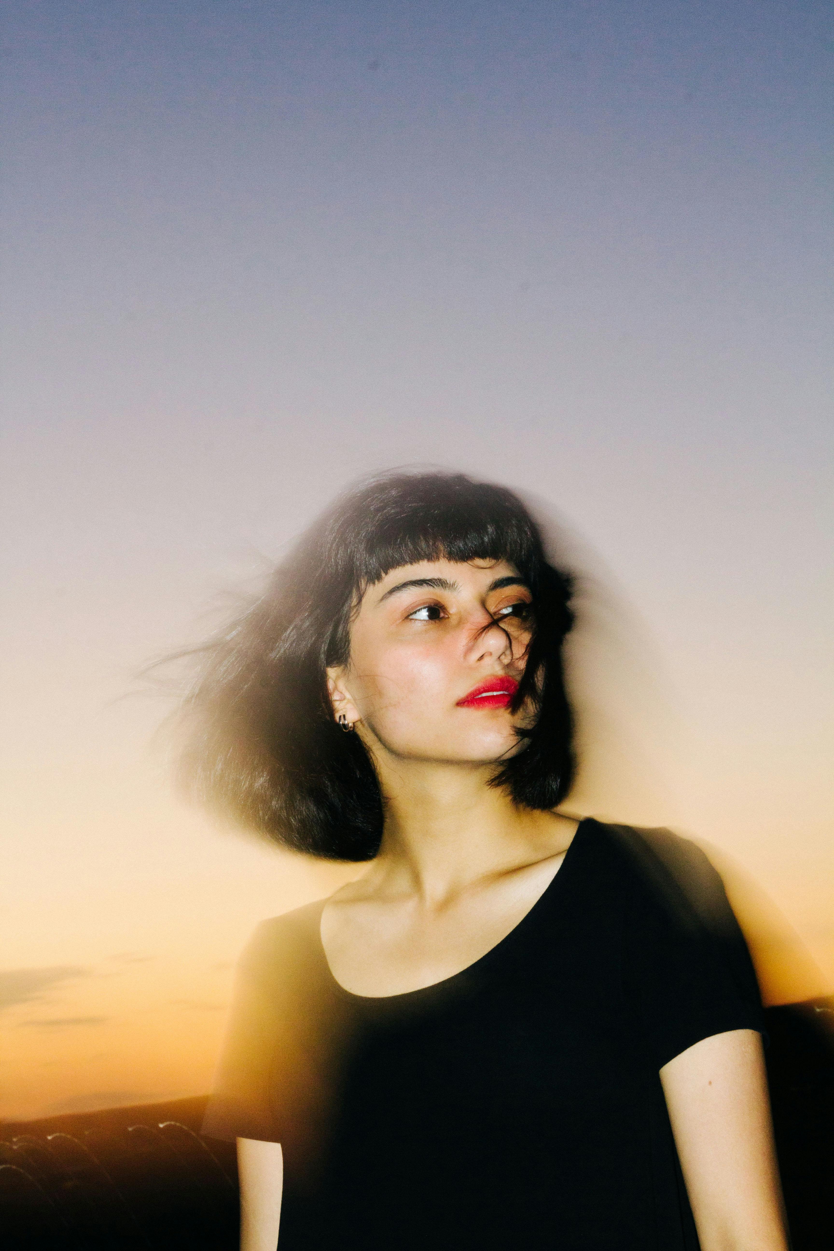 Portrait of a young woman with short hair posing outdoors during sunset.