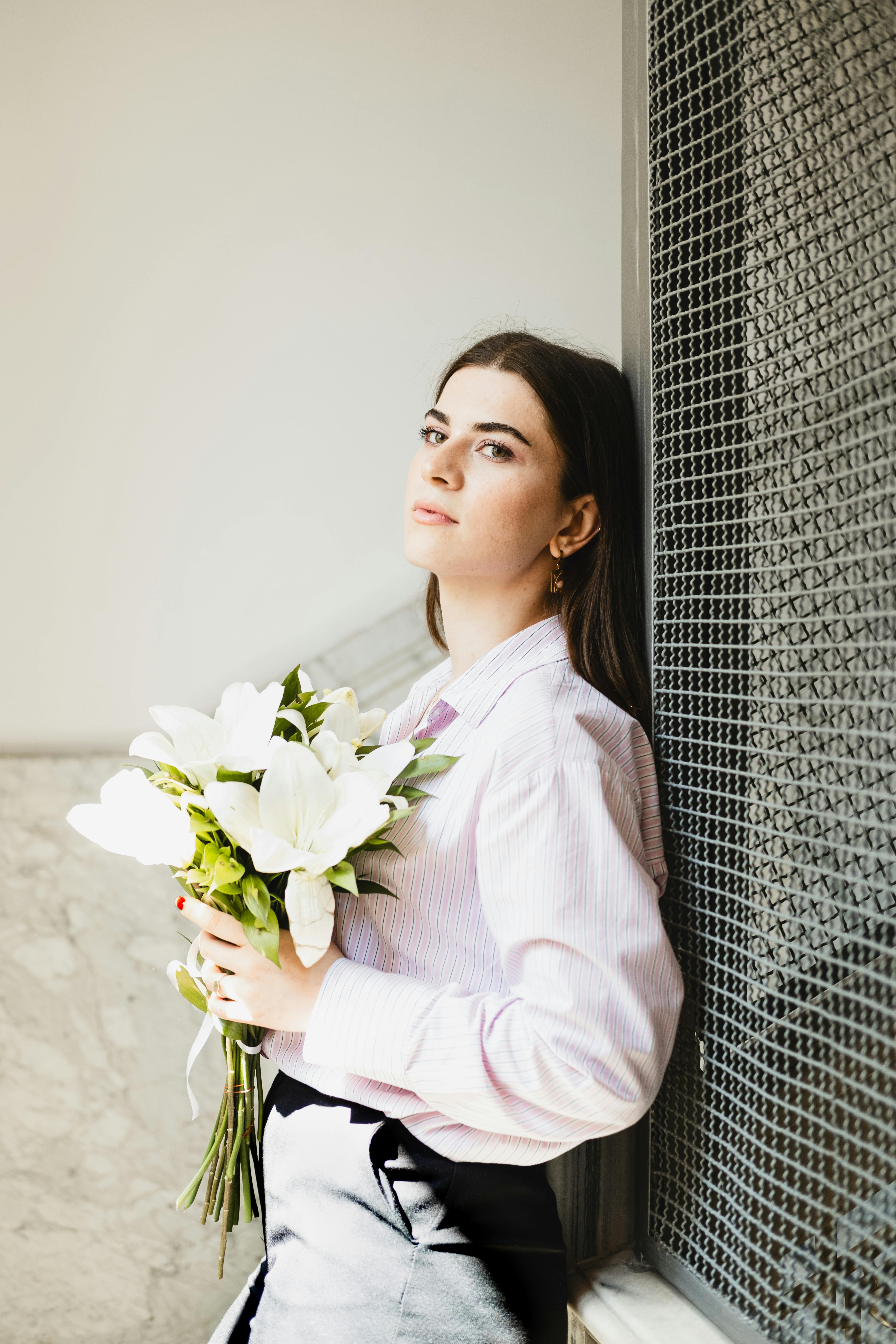 Portrait of a woman holding white flowers indoors, reflecting a serene and elegant mood.