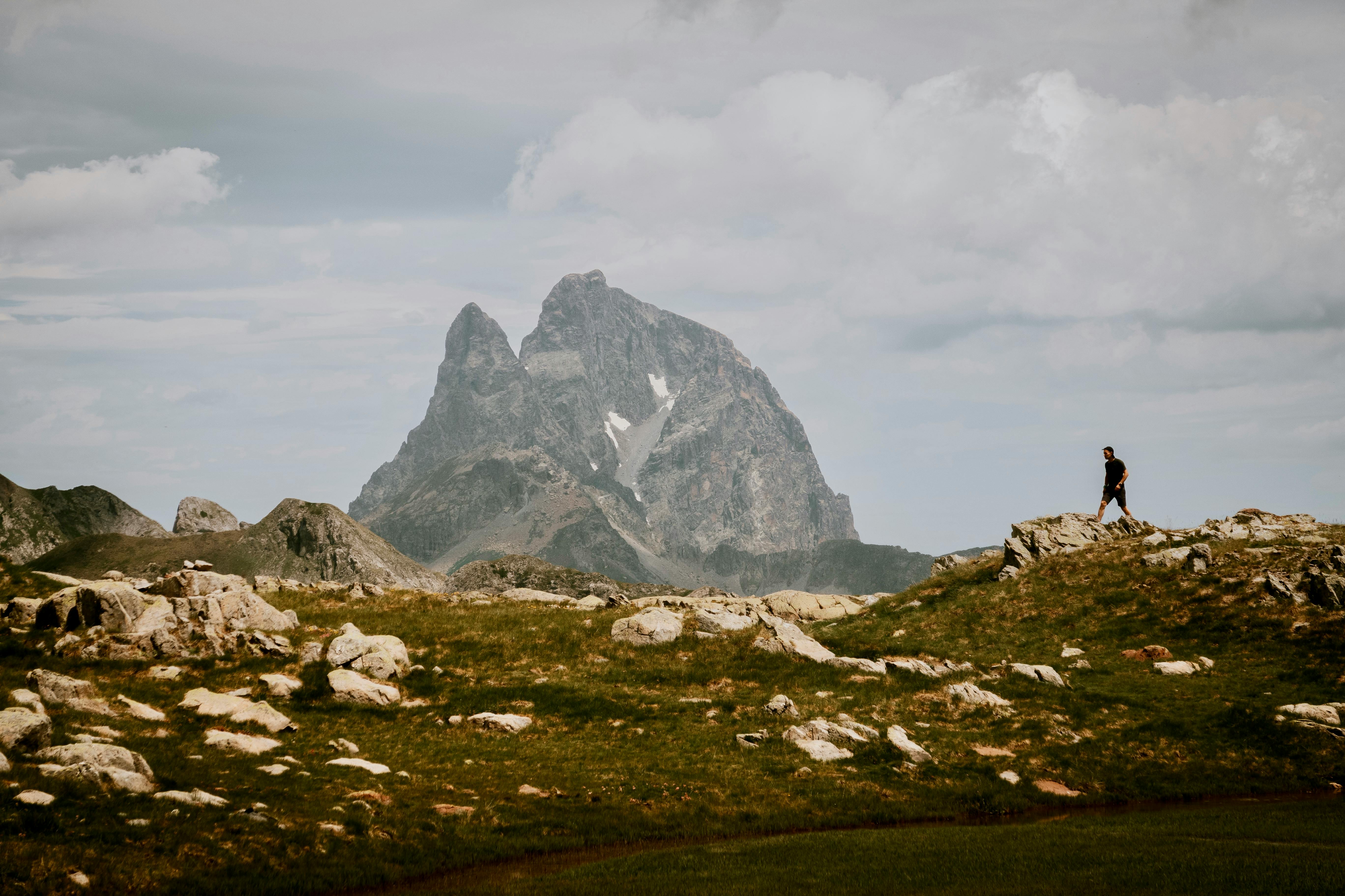 Man hiking in scenic mountain terrain with majestic Pic du Midi d'Ossau in background.