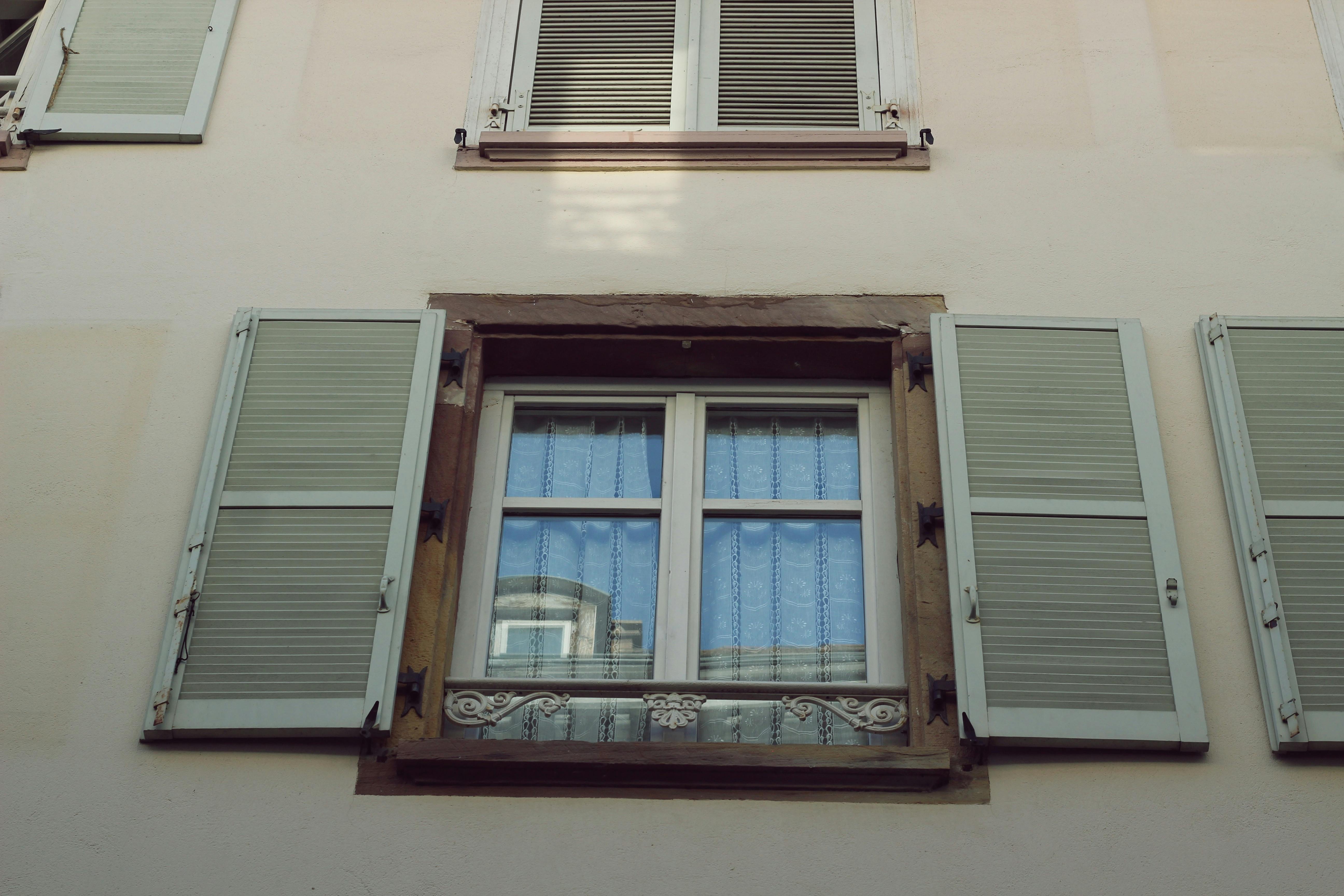 Elegant facade featuring light green shuttered windows and ornate details, capturing a timeless architectural style.