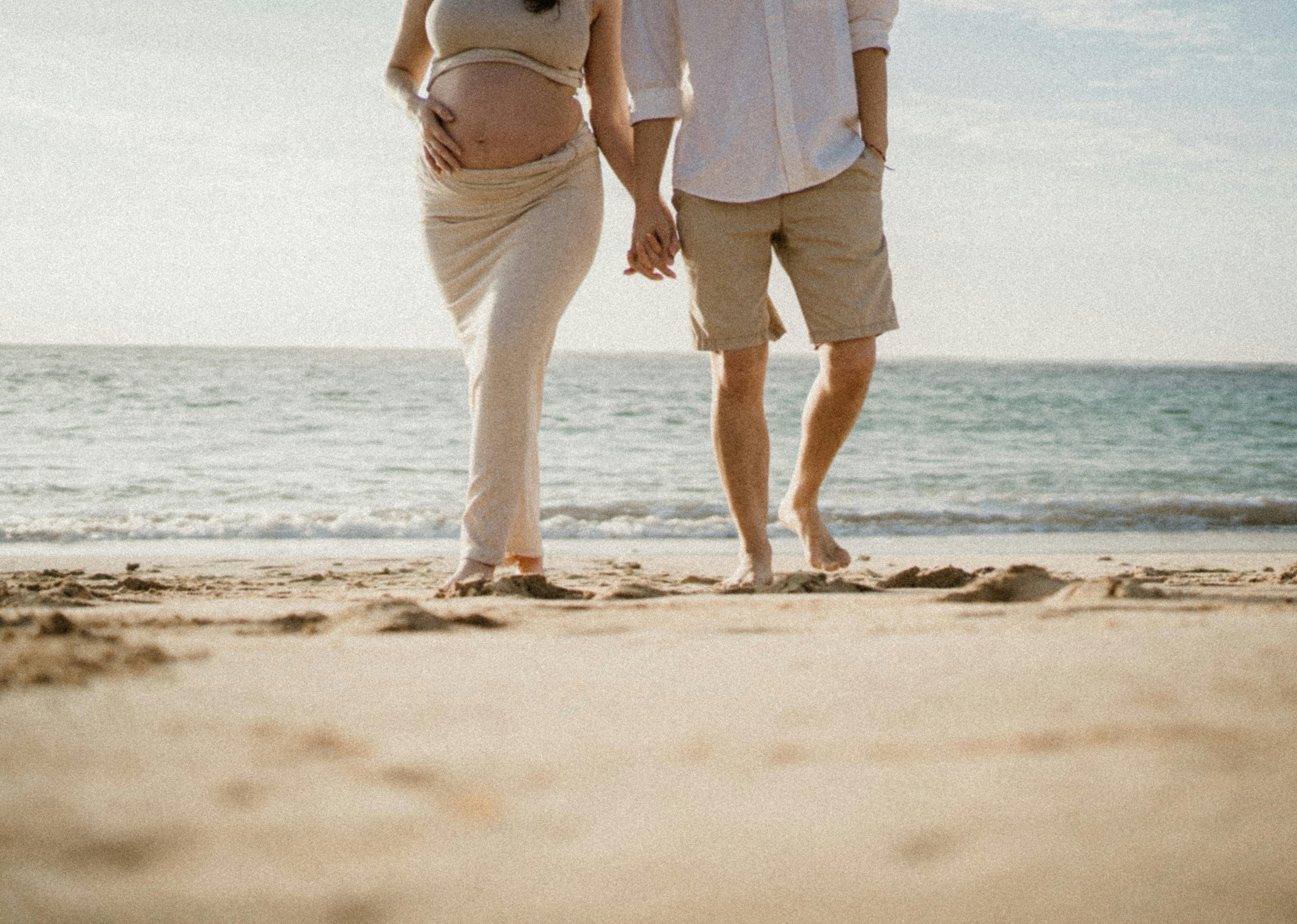 A pregnant couple holding hands while walking barefoot on a sunny beach.