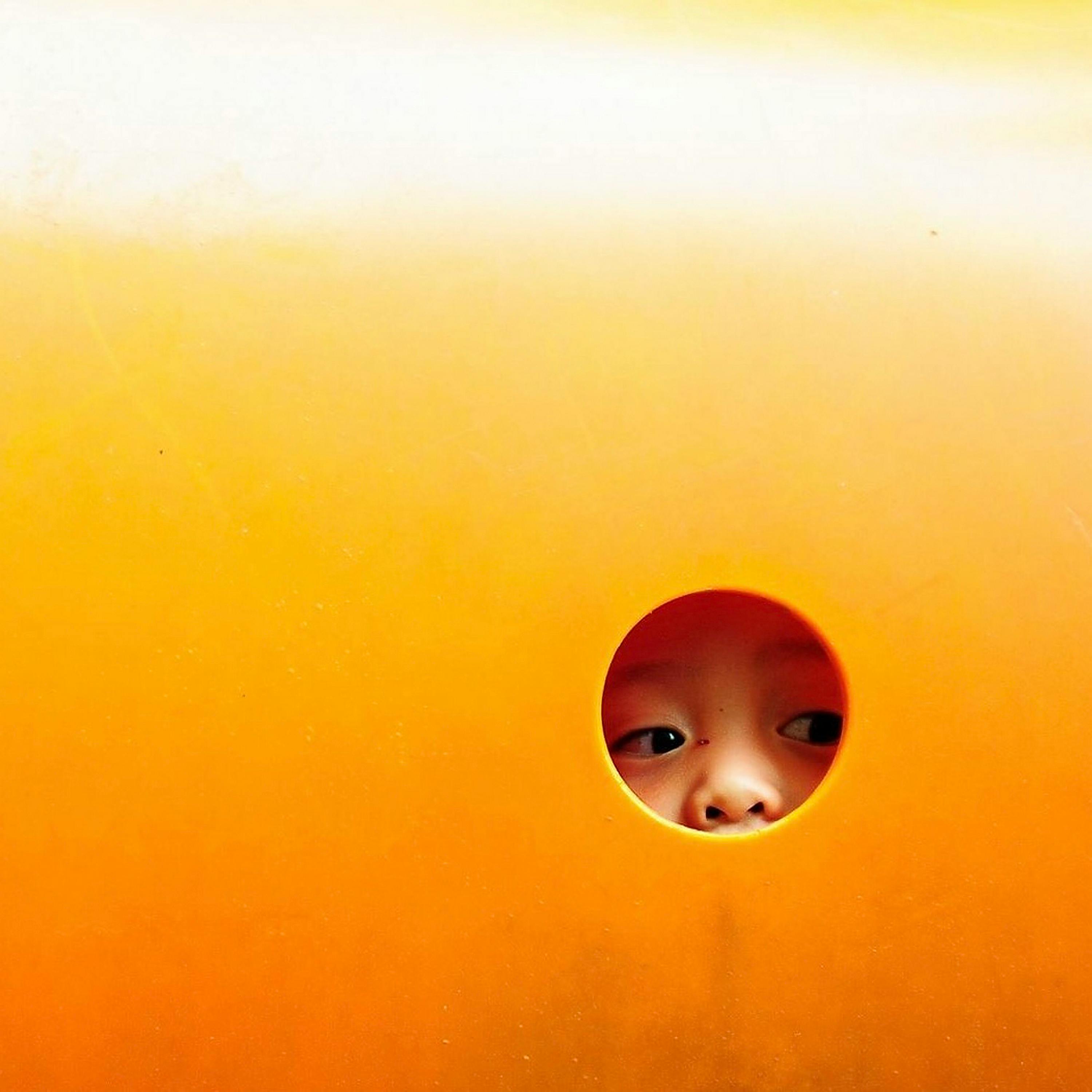 A child peeks through a circular hole in vibrant orange playground equipment.