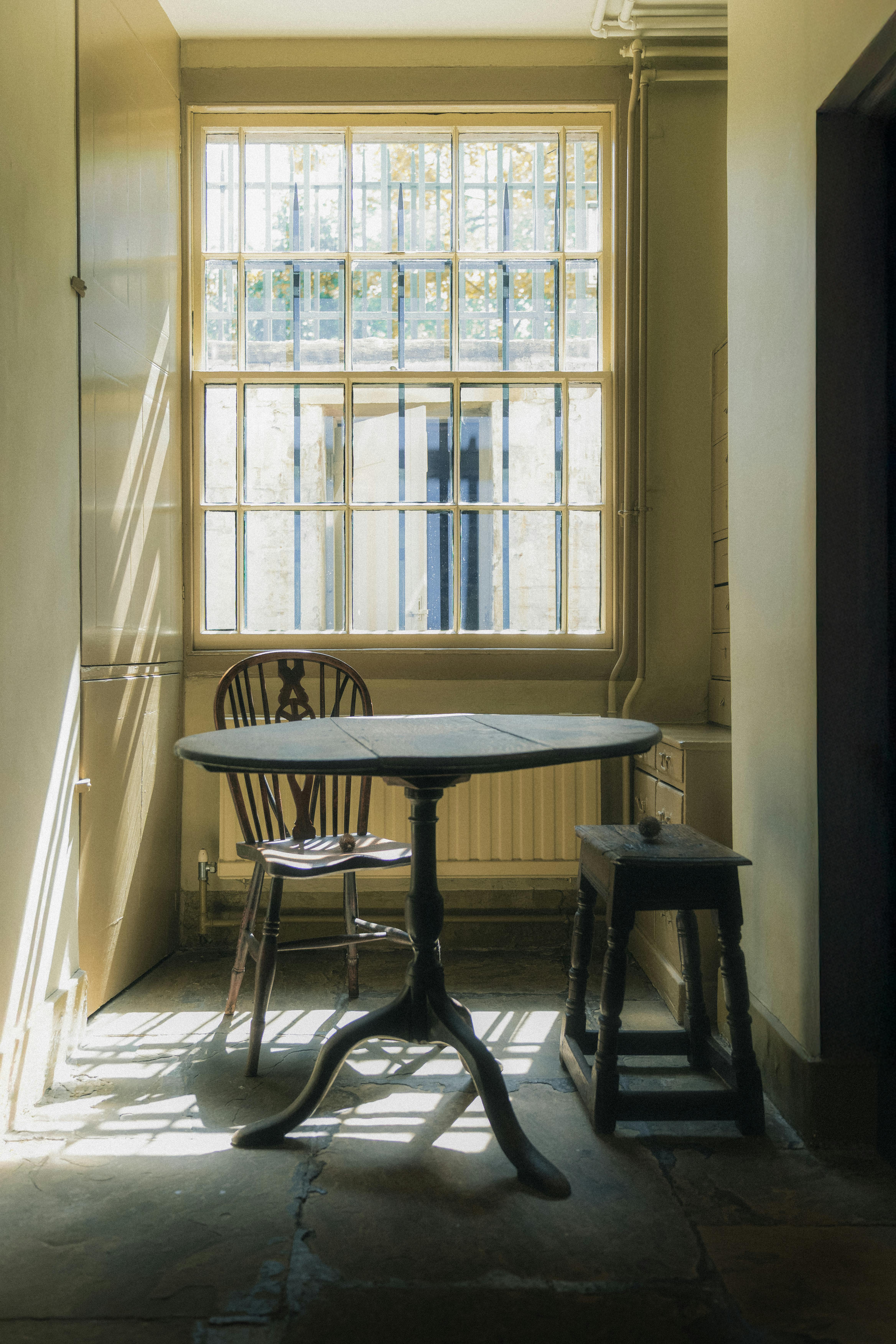 A warm, sunlit room in London featuring vintage furniture by a window, creating a serene ambiance.