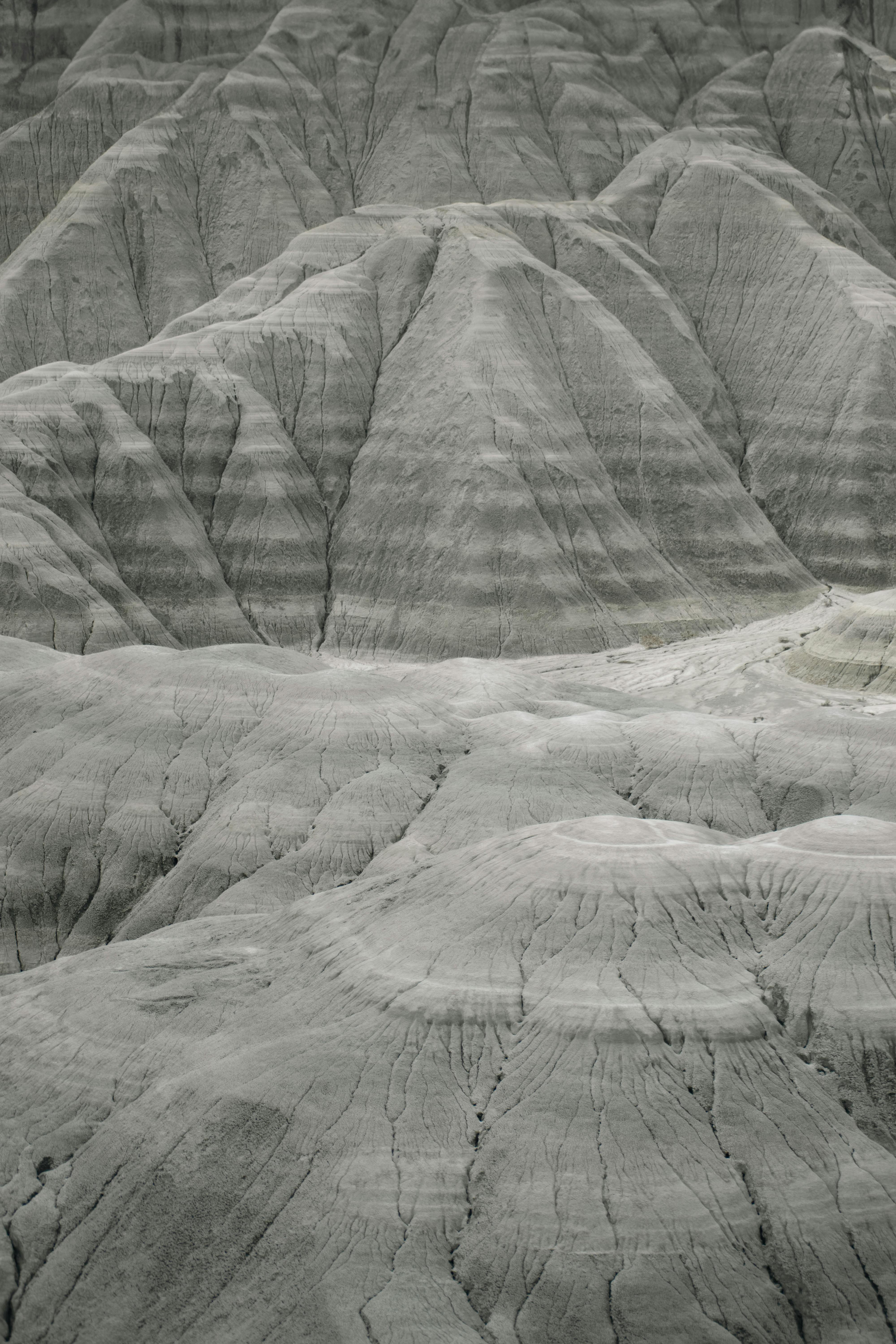 Aerial view of striking badlands showcasing eroded sedimentary layers and rugged textures.