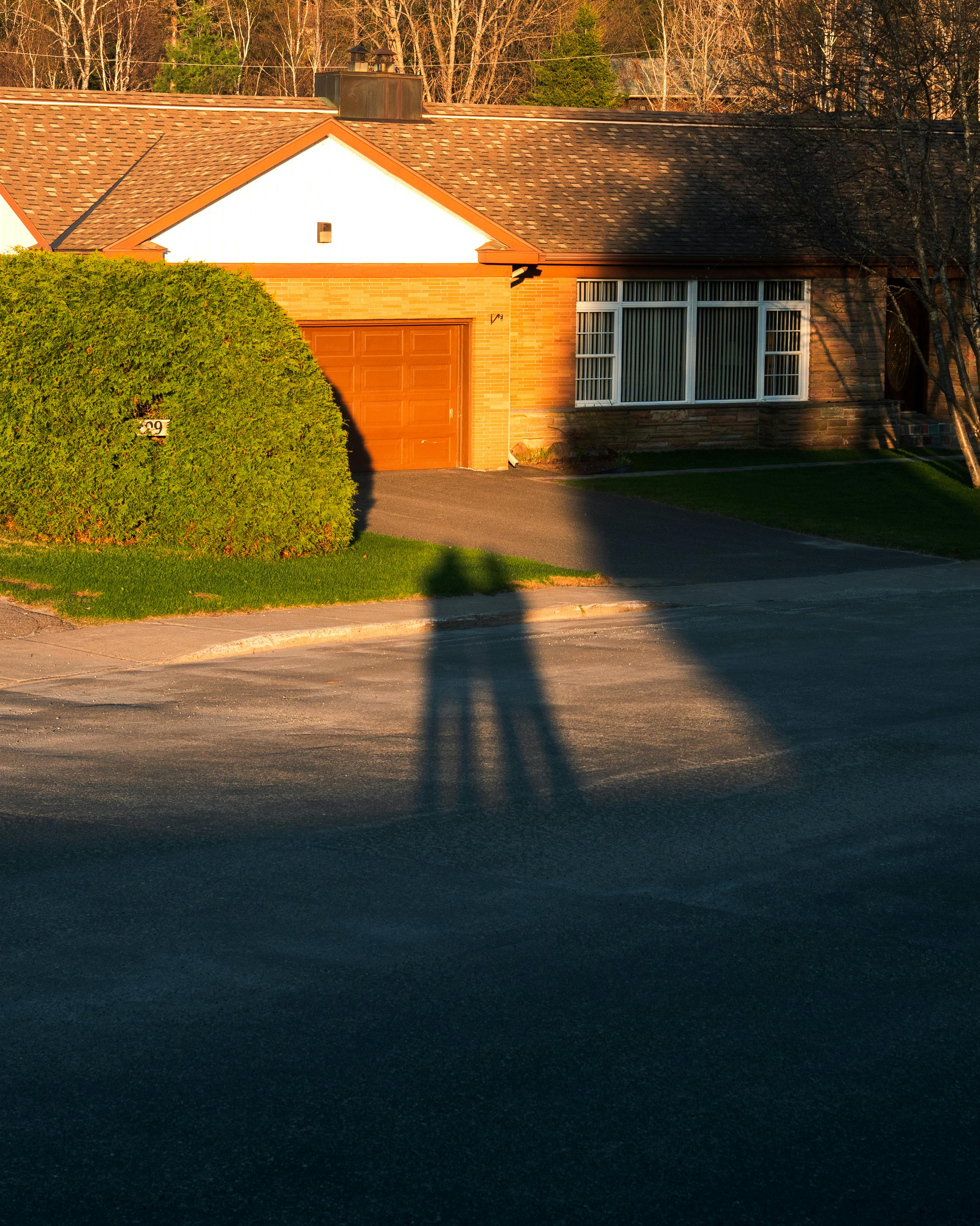 A peaceful suburban house with long shadows during sunset in Sainte-Agathe-des-Monts, Quebec.